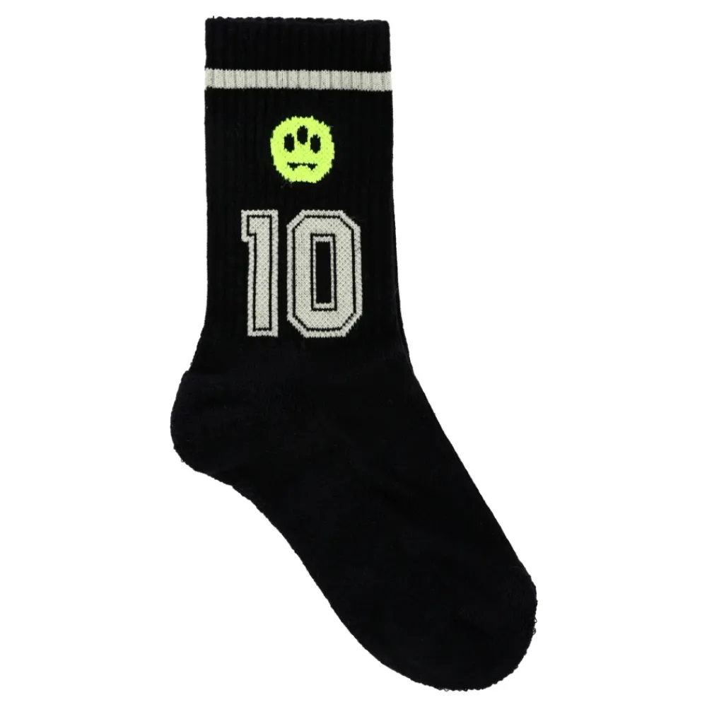 Upgrade de sokkenlade van je kind met deze zwarte terry sokken van BARROW. Voorzien van een geribbeld design en versierd met de iconische gele smiley en cijfers aan de zijkanten. Gemaakt in Italië van 90% katoen, 7% polyamide en 3% elastaan. Machinewasbaar op 30°C.