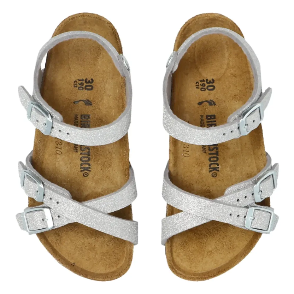 ‘KUMBA’ SANDALEN van Birkenstock Kids schitteren met elegantie in een zilveren tint, waarbij klassiek design wordt gecombineerd met uitzonderlijke functionaliteit. Hun subtiel glinsterende banden, vervaardigd uit hoogwaardig synthetisch materiaal dat leer imiteert, creëren een sensuele opstelling – twee aan de voorkant en één rond de enkel – vastgemaakt met verstelbare zilveren gespen. Door de open constructie zorgen de sandalen voor optimale ventilatie en hebben ze een uitzonderlijk ergonomisch en anatomisch voetbed van natuurlijk kurk. De antislip synthetische zool garandeert zelfverzekerde stappen, terwijl zorgvuldig gekozen prints – het Birkenstock-logo en handtekening – hun originaliteit benadrukken. De aandacht voor comfort en duurzaamheid maakt ze de perfecte keuze voor zomerdagen vol familieactiviteiten. WAAROM DIT PRODUCT KOPEN? * Verfijnd, zilverkleurig ontwerp met een subtiele glans * Ergonomisch kurken voetbed ondersteunt de juiste voetontwikkeling * Antislip zool zorgt voor veiligheid * Originele merkdetails garanderen authenticiteit * Verstelbare gespen zorgen voor een perfecte pasvorm Zoolhoogte: 1,5 cm