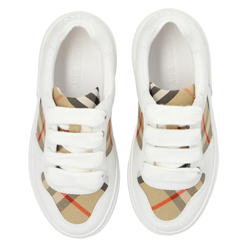 Elegantie en comfort komen samen in deze Burberry sneakers met ruitpatroon, vervaardigd uit premium leer voor dagelijks gebruik met een onberispelijke stijl. Belangrijkste kenmerken: Wit | Multicolor | Leer | Vetersluiting voor perfecte pasvorm | Ruitpatroon | Glanzende textuur | Laag silhouet | Afmetingen en pasvorm: Normale pasvorm | Samenstelling en onderhoud: Leer | Synthetische materialen | 100% rubberen zool | Reinigen met een zachte doek