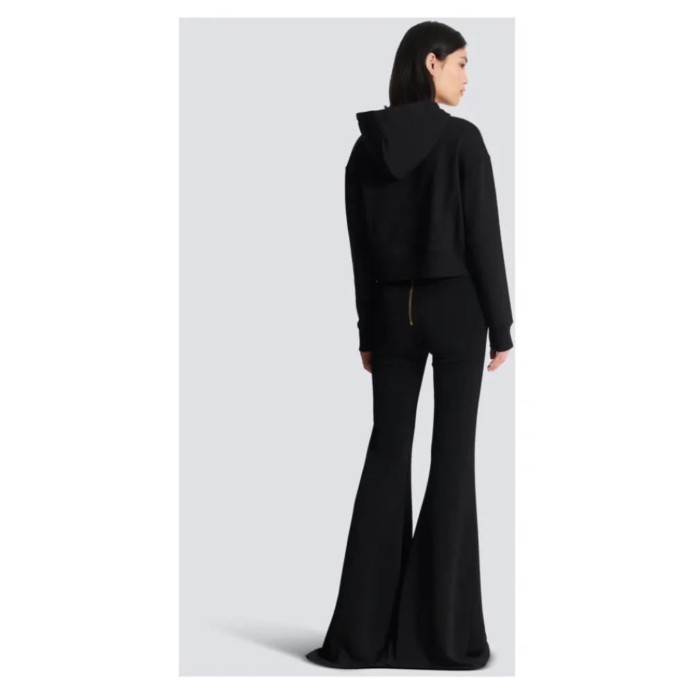 Geknipte sweatshirt van dik katoenen jersey Neon Balmain Paris-logo gedrukt op de voorkant Kort model Lange mouwen Brede geribbelde afwerking bij de manchetten en taille Capuchon met trekkoord Gouden metalen oogjes, stoppers en aglets Model is 178 cm lang en draagt maat S Hoofdmateriaal: 100% gecertificeerd katoen Gemaakt in Portugal Artikel: BF4JP011GD13 100% van de katoenvezels in dit kledingstuk is afkomstig van landbouw en gecertificeerd