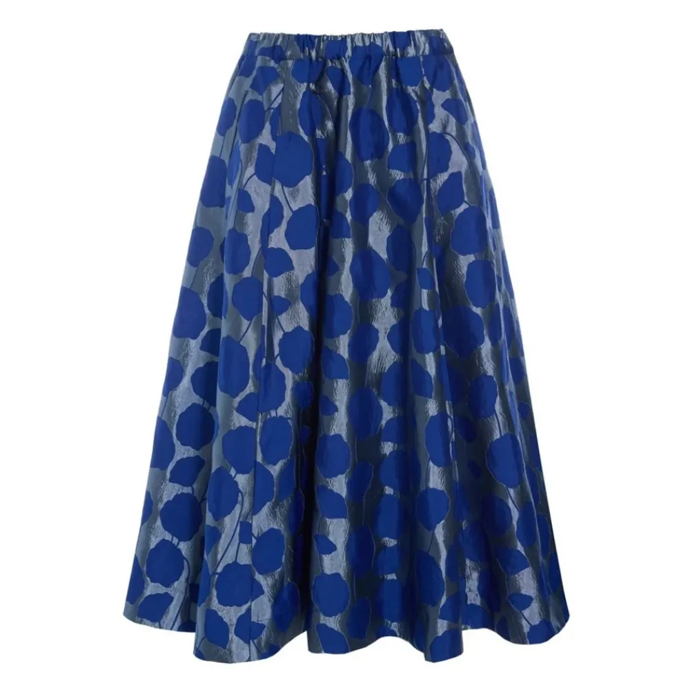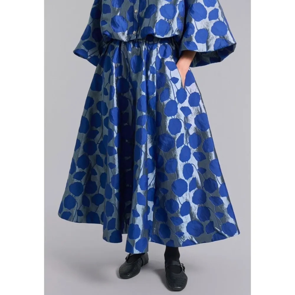 Bitte Kai Rand Midi Rok in een glanzende jacquardstof met grafische bloemenranken, ontworpen om een volumineus, gekleed silhouet te creëren voor zowel alledaagse als speciale gelegenheden. Belangrijkste kenmerken: Blauw | Frisse blauwe flowerbomb | Jacquard | Gestructureerde stof | Behoudt volume | Volledige lengte | Geschikt voor dag- en avondkleding | Glanzende jacquard afwerking | Grafisch bloemenrankenpatroon | Volumineus silhouet | Afmetingen & pasvorm: Volledige lengte vanaf de taille in maat S: ca. 89 cm. | Model is 181 cm lang en draagt maat S.
