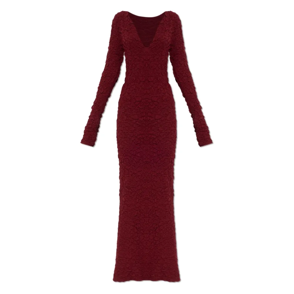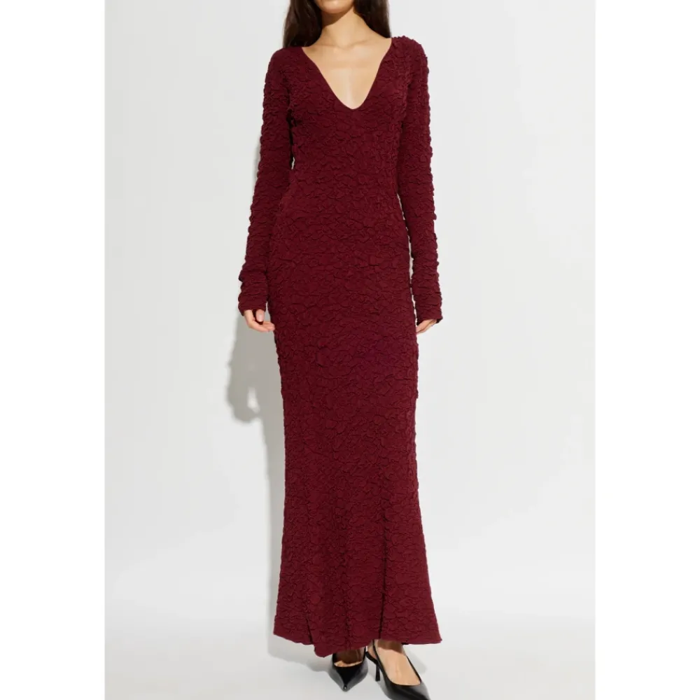 De By Malene Birger Venus Dress is een lange, figuurvolgende maxi-jurk die is ontworpen om speciale gelegenheden te verfraaien met een kenmerkende getextureerde afwerking. Het gebeeldhouwde silhouet en de rijke bordeauxrode kleur maken het een verfijnde keuze voor avondevenementen en formele bijeenkomsten. Belangrijkste kenmerken: Rood | Bordeaux | Viscose | Stretchstof | Zachte, comfortabele pasvorm | 3D-reliëftextuur met onregelmatig gerimpeld patroon | Diepe V-vormige halslijn | Lange, nauwsluitende mouwen | Licht uitlopende zoom | Figuurvolgend silhouet | Afmetingen & pasvorm: Lengte model: 177 cm | Borst: 83 cm | Taille: 61 cm | Heupen: 89 cm | Model draagt maat: S | Slim fit | Figuurvolgend silhouet | Licht uitlopende zoom | Samenstelling & verzorging: 68% viscose (LENZING™ ECOVERO™) | 15% polyamide | 17% elastaan | Fijne machinewas op 30°C