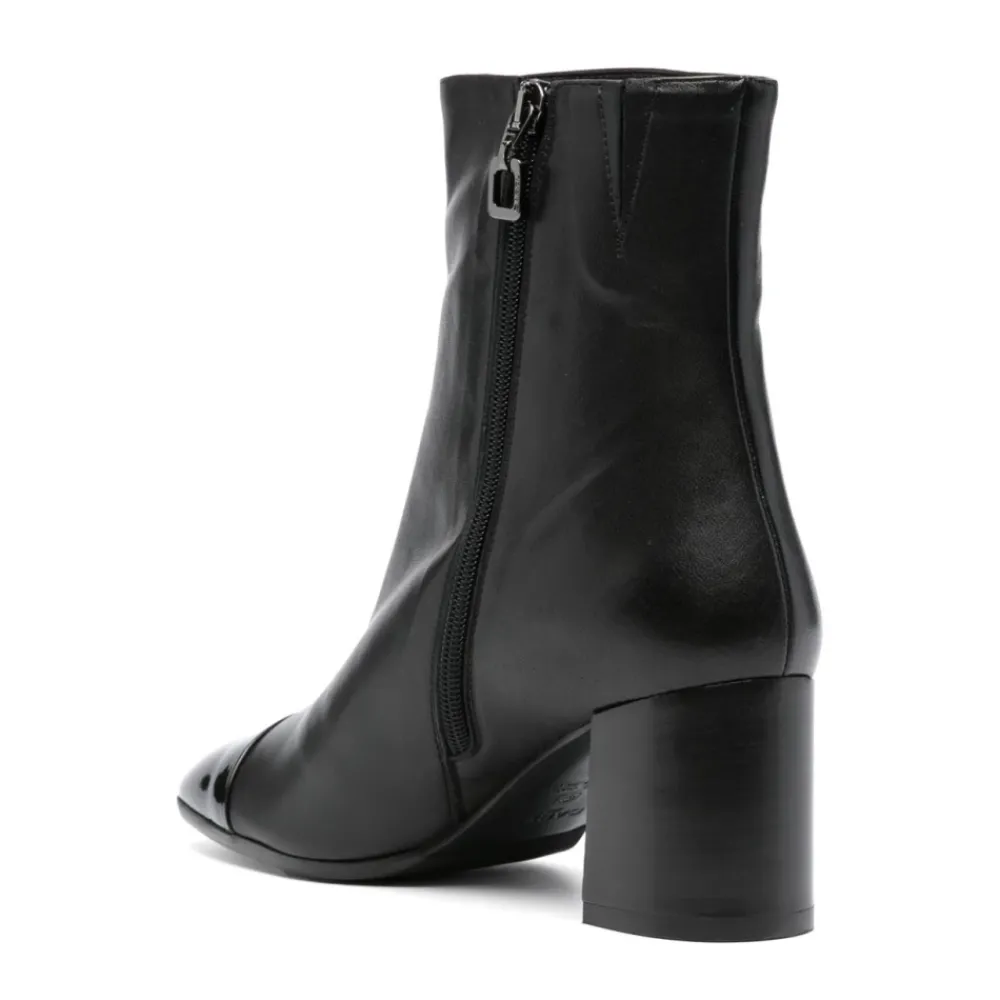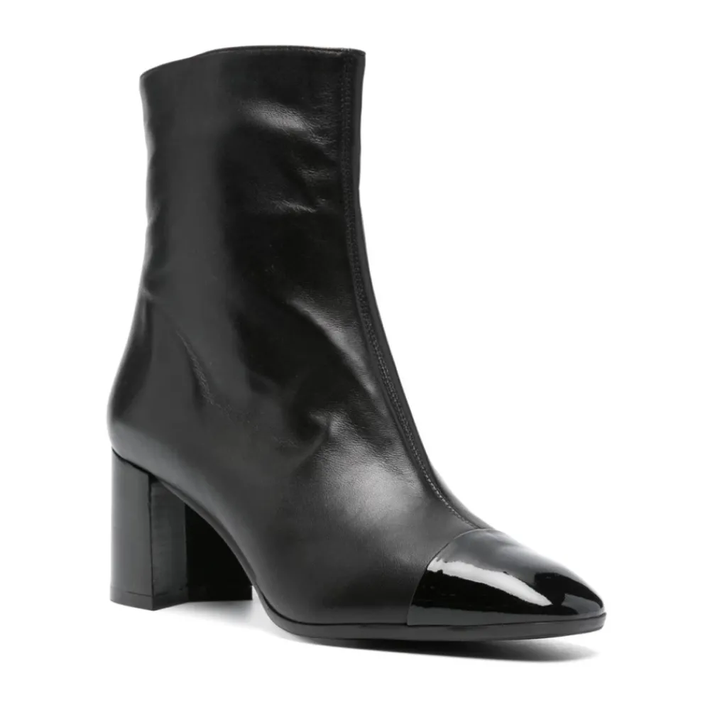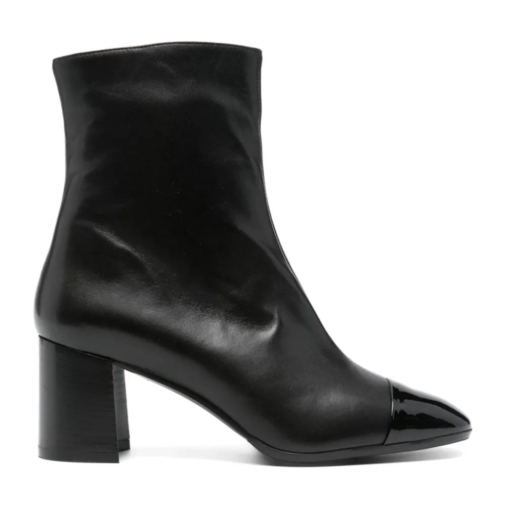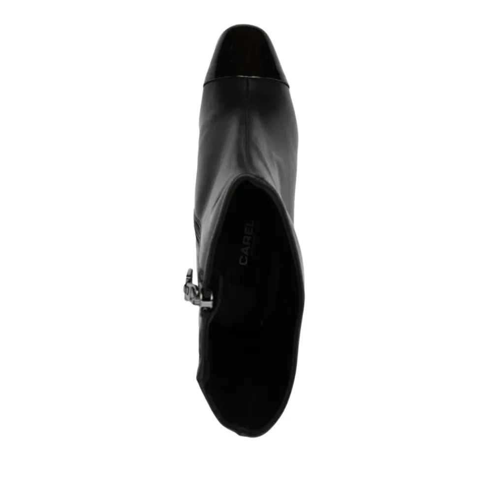 Verrijk je stijl met deze Carel enkellaarsjes met hak. Gemaakt van zwart kalfsleer met een contrasterende neuskap, hebben deze enkellaarsjes een blokhak van 70 mm voor een comfortabele lift. De zijrits en elastische details zorgen voor een perfecte pasvorm, terwijl de amandelvormige neus een vleugje verfijning toevoegt. Afgewerkt met een merkleren binnenzool en rubberen buitenzool, worden deze laarsjes geleverd met een beschermende stofzak.