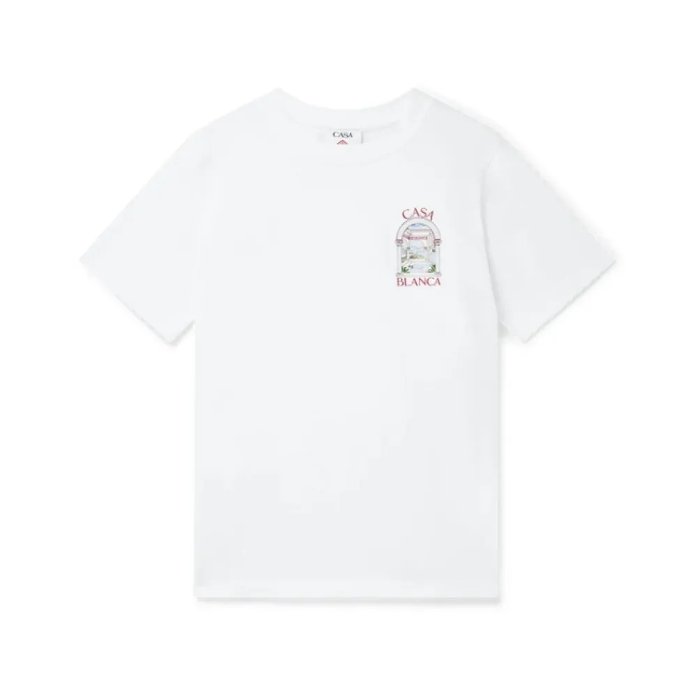 Het Casablanca Le Passage t-shirt is een model met korte mouwen gemaakt van biologisch katoen en versierd met seizoensillustraties van het huis, met vier verschillende dimensies die spelen met perspectieven en architectuur. Het wordt aangevuld met een klassieke ronde hals. Stof: 100% biologisch katoen. Kleur: wit. Fijne machinewas. Gemaakt in Portugal. Het model is 187 cm lang en draagt maat M. Ref: U-MPS25-JTS-001-07.