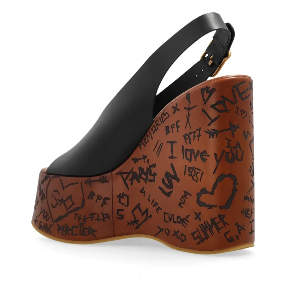 Maak kennis met de ‘MAXIME’ WEDGE SANDALEN uit de exclusieve CHLOÉ-collectie. Deze verfijnde sandalen combineren uitzonderlijke elegantie met een moderne, stedelijke stijl en vormen een opvallende toevoeging aan elke garderobe. Het kenmerkende kenmerk van dit model is het ZWARTE LEDEREN BOVENWERK met open tenen en een verstelbare enkelband met een GOUDEN GESP. De bruine sleehakken, versierd met zwarte graffiti-achtige letters en afbeeldingen, geven de sandalen een unieke, artistieke uitdrukking. Het interieur van bruin leer biedt ongeëvenaard draagcomfort, terwijl de rubberen zool duurzaamheid en stabiliteit garandeert. De ‘Maxime’ sandalen passen perfect bij zowel elegante als casual outfits, bieden comfort en een modieuze uitstraling. WAAROM ZOU U DIT PRODUCT KOPEN? * Uniek ontwerp dat elegantie combineert met moderne stijl. * Volledig gemaakt van het hoogste kwaliteitsleer. * Comfortabel om te dragen dankzij het leren interieur. * Uitzonderlijke sleehakken met artistieke versieringen. * Geproduceerd door het gerenommeerde merk Chloé, een symbool van vooruitgang en tijdloze mode. Sleehakhoogte: 15cm Plateauhoogte: 6,5cm