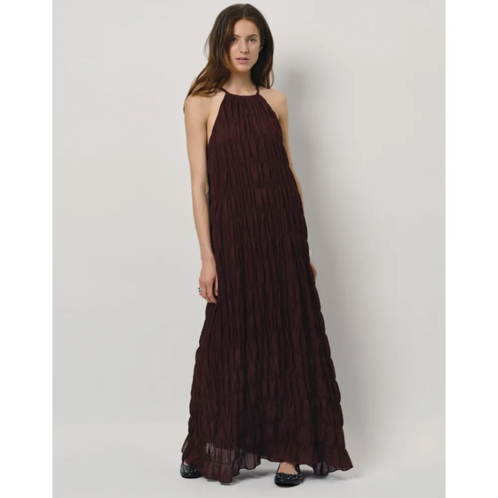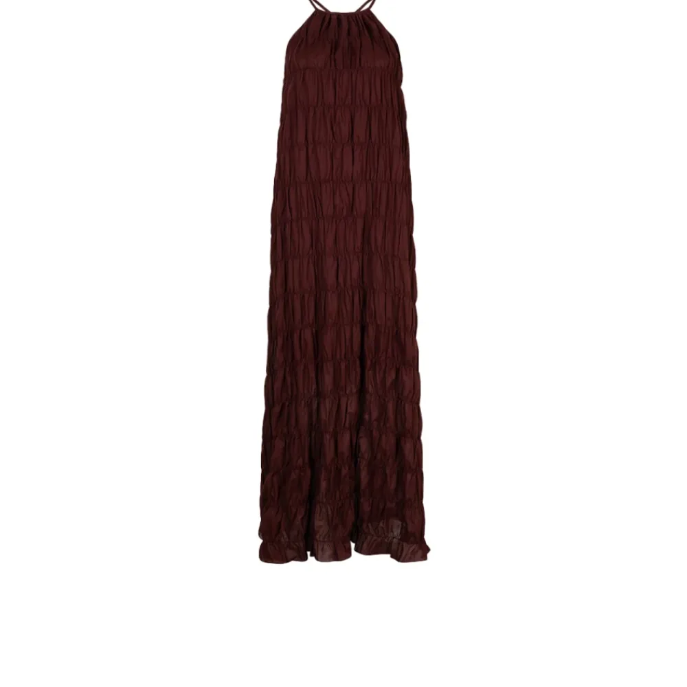Upgrade je zomergarderobe met de Dante 6 Nelkis jurk in Cacao Brown. Deze halternek boho-stijl heeft een vloeiende, A-lijn silhouet in lichtgewicht katoenen voile. Perfect voor je volgende vakantie, deze smocked halter maxi jurk heeft een chique knoopsluiting met een split aan de achterkant. Volledig gevoerd en moeiteloos chic. Model is 1,78 m lang en draagt maat 36.