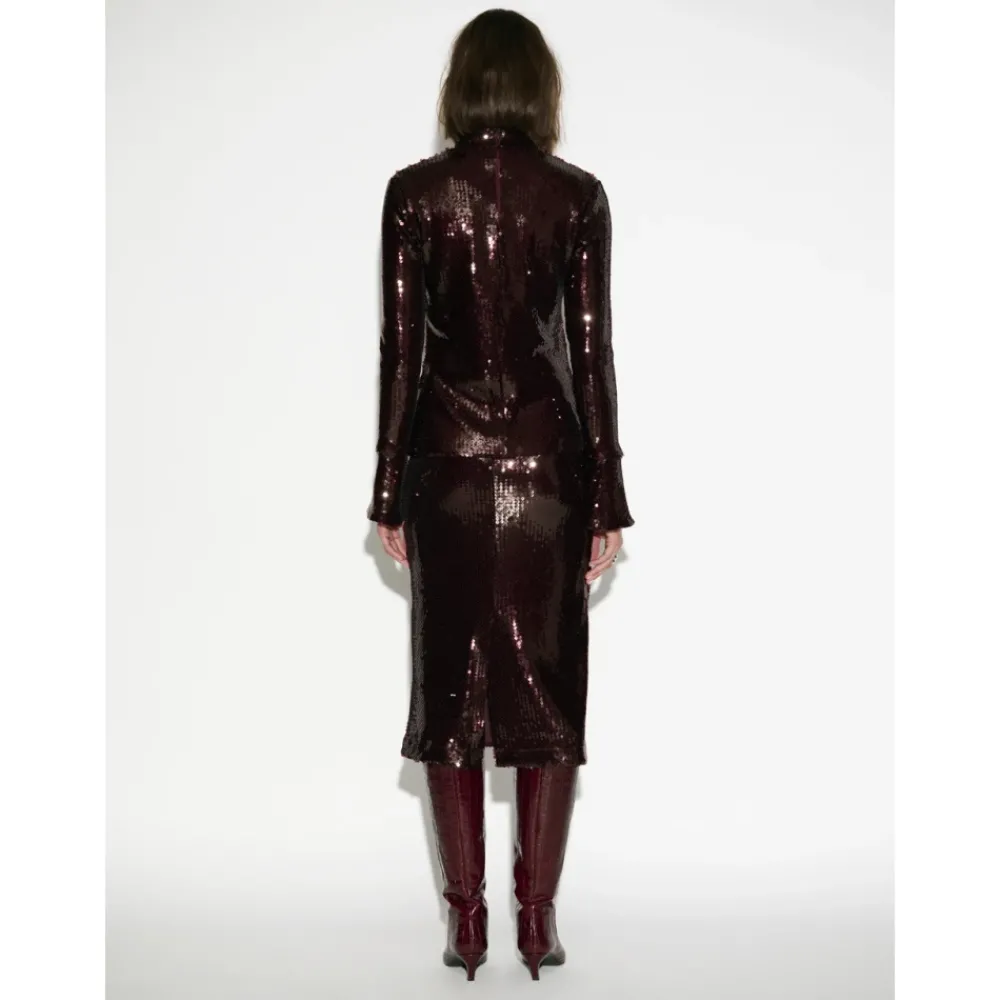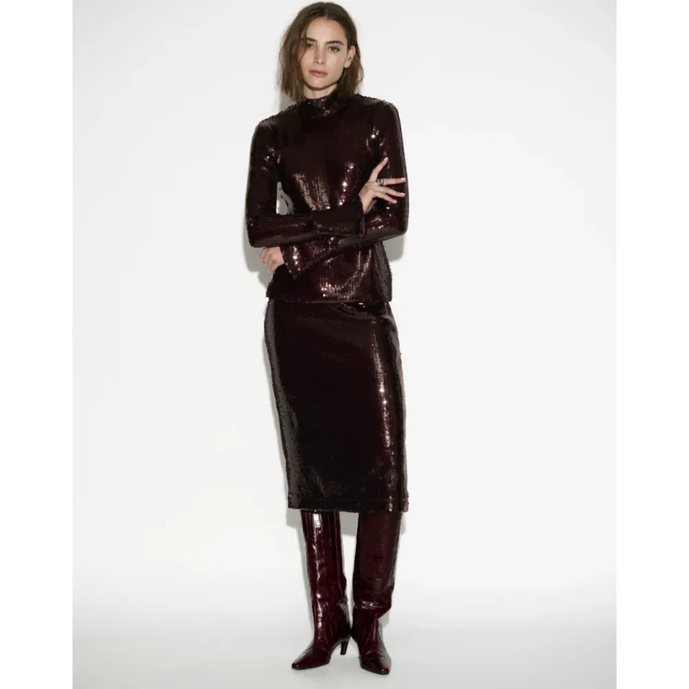 De Dante 6 Paige Sequins Top brengt een opvallende sprankeling in avond- en gelegenheidskleding met een slank silhouet en een all-over paillettenversiering. Belangrijkste kenmerken: Donker kersenrood | Rood | Pailletten | Stretch overlay | Blinde ritssluiting aan de achterkant | Volledig gevoerd | Onderdeel van een set | Hoge ronde halslijn met zachte voering | Ronde kraag | Lange mouwen | Licht uitlopende manchetten | All-over paillettenversiering | Afmetingen & pasvorm: Slanke pasvorm