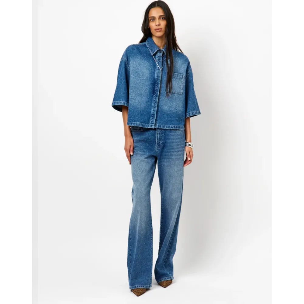 Upgrade je denimcollectie met de Nuit Rhinestone wide leg jeans in Vintage blauw van Dante 6. Deze statement jeans zijn voorzien van strass-steentjes op gewassen denim, een klassiek ontwerp met vijf zakken en wijde pijpen voor een trendy look. Gemaakt van een comfortabele katoenmix, zijn deze jeans perfect om een stijlvolle indruk te maken. Combineer ze met de bijpassende denim blouse Daisy voor een complete DANTE6-outfit. Het model is 1,78 m lang en draagt maat 36.