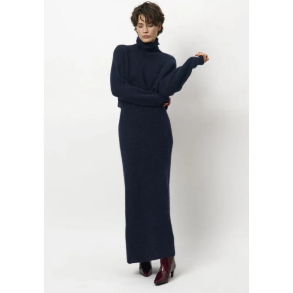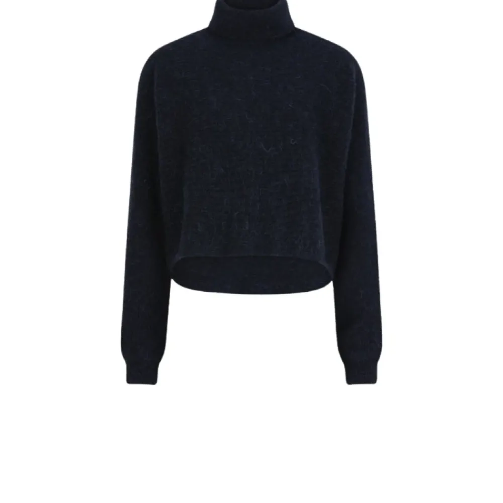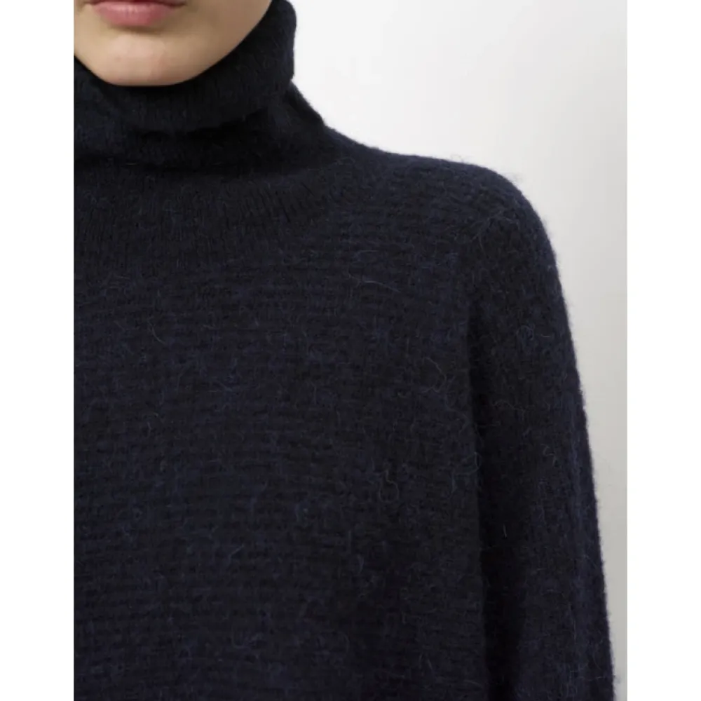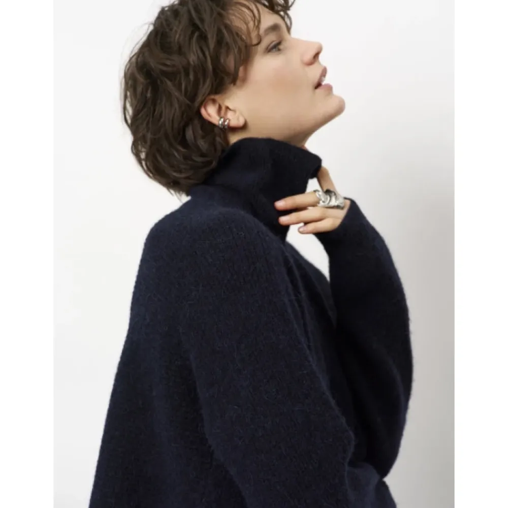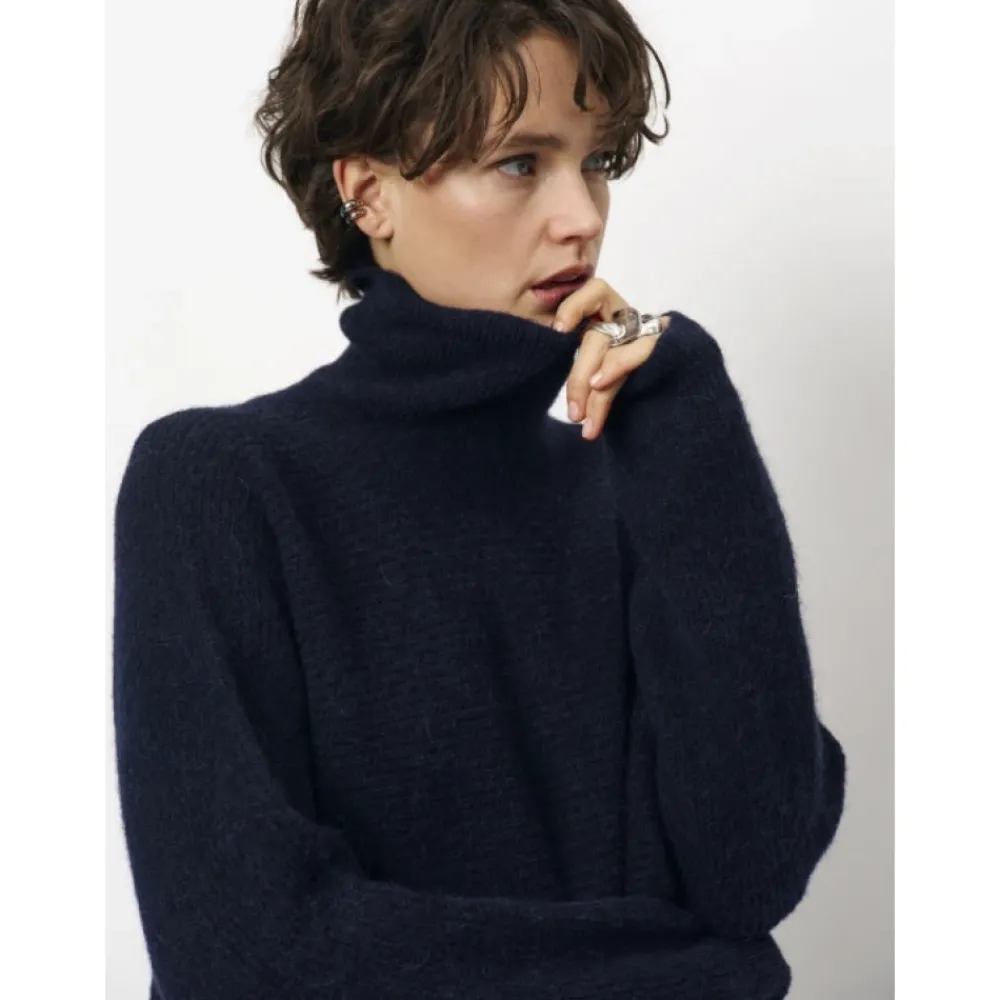 Je zult de Yuria trui in Nocturnal Blue deze seizoen niet meer uit willen trekken. Het heeft een korte voorkant met een langere achterkant en een hoge col. De geribbelde brei is gemaakt van een superzachte mix van alpaca en merinowol. Het heeft lange mouwen met geribbelde manchetten. Combineer het met een spijkerrok voor een modieuze look.
