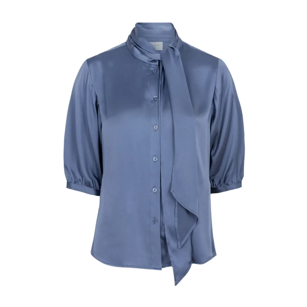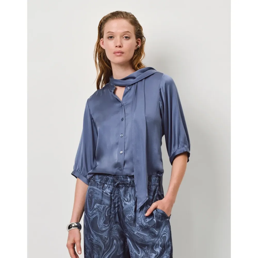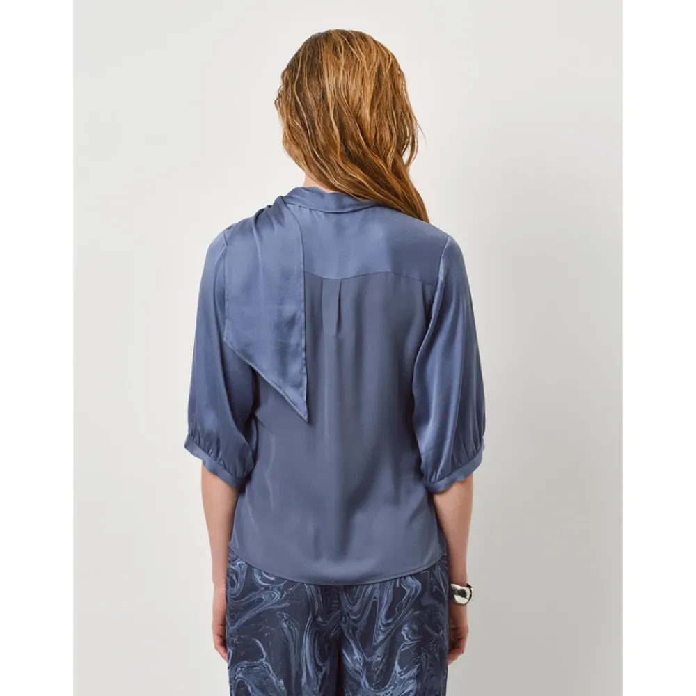 Verwen jezelf met de luxueuze Vaila zijden sjaalblouse in Storm Blue van Dante 6. Gemaakt van gezandstraalde stretchzijde met een contrasterende stof aan de achterkant, heeft deze delicate blouse een afneembare zijden sjaal en halflange mouwen met verfijnde plooien. Val op met deze luxueuze gezandstraalde stretchzijden sjaalblouse die wordt geleverd met een afneembare sjaal en contrasterende georgettestof aan de achterkant. Het model op de foto is 1,78 m lang en draagt maat 36.