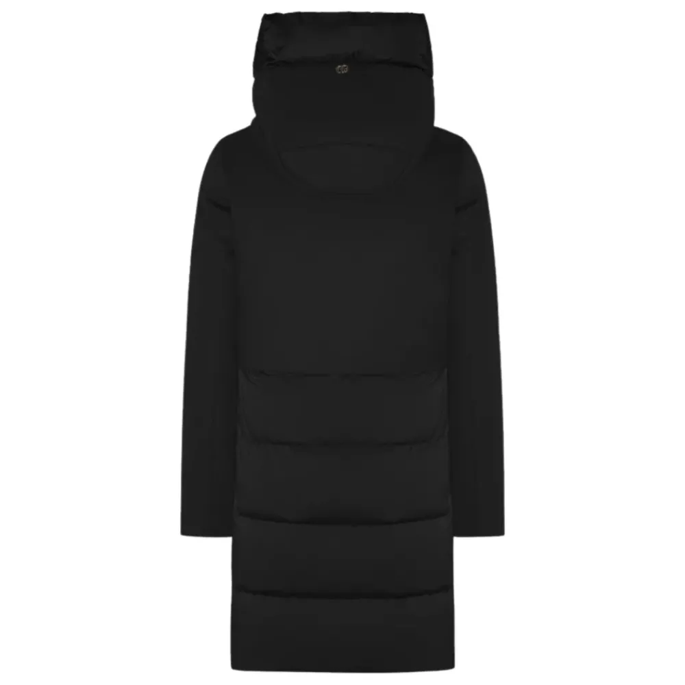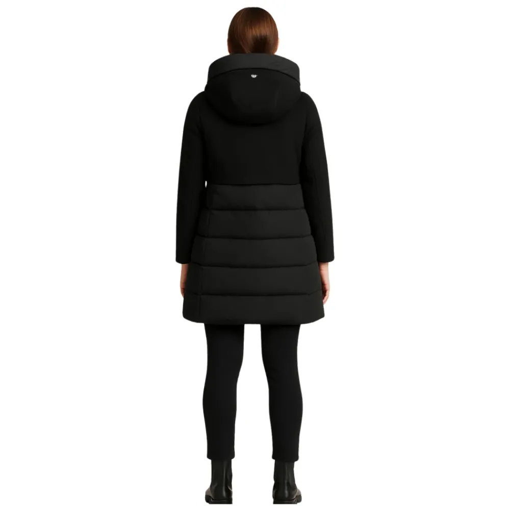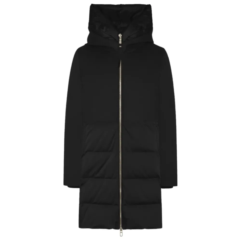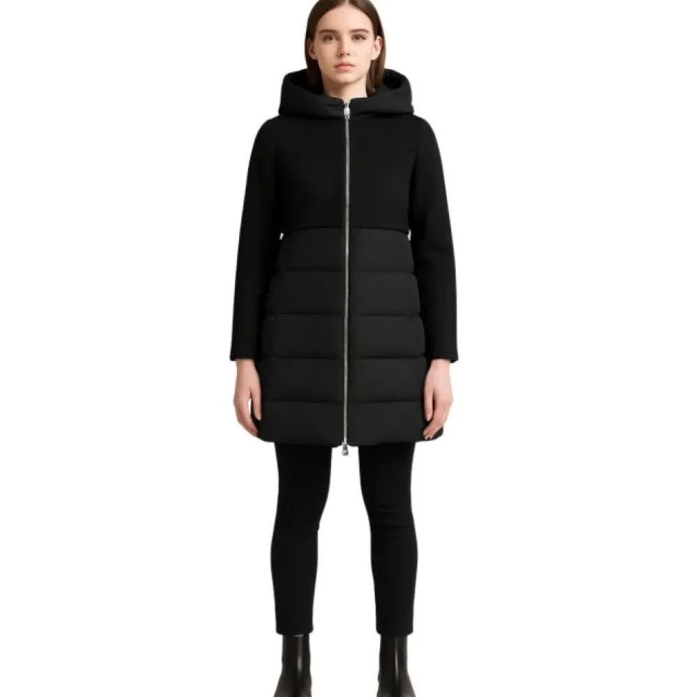 Deze Duno jas combineert eigentijds design en functionaliteit in één stuk. Het bovenste deel is gemaakt van glad technisch materiaal, terwijl het gewatteerde onderste deel met veren vulling warmte en lichtheid biedt. Het model heeft een omslagcapuchon, een voorzijde met dubbele ritssluiting en verborgen zijzakken. De licht uitlopende snit en medium lengte zorgen voor comfort en bescherming op koude dagen, zonder afbreuk te doen aan de typische stedelijke stijl van het merk. Lijn: Duno Pasvorm: Normaal met licht uitlopende onderkant Sluiting: Dubbele ritssluiting van metaal Details: Geïntegreerde capuchon, gewatteerde quiltpanelen Samenstelling: Buitenkant van technisch materiaal en nylon, natuurlijke verenvulling Kleur: Zwart Gemaakt in Italië. Stofdetails: 100% polyester.