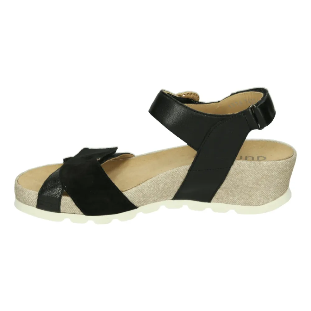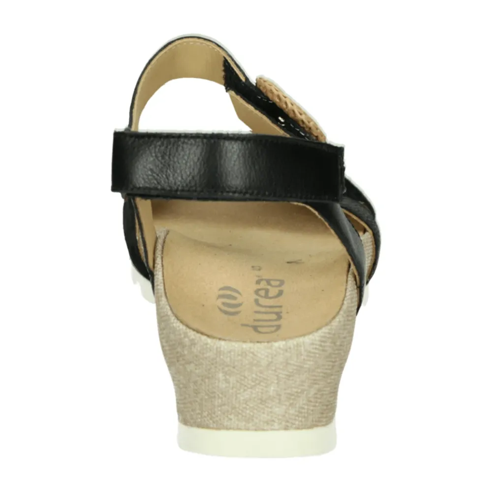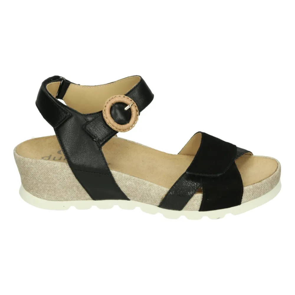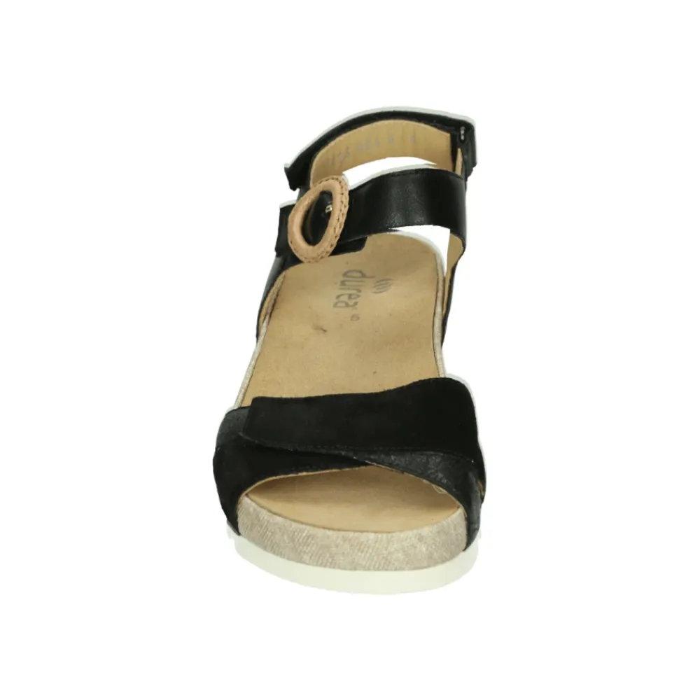Ontdek de elegante Durea damessandaal, model 7425 G, in klassiek zwart. Met een G-breedte en uitneembaar voetbed, is deze sandaal gemaakt van een mix van leer en suède met een rubberen zool.