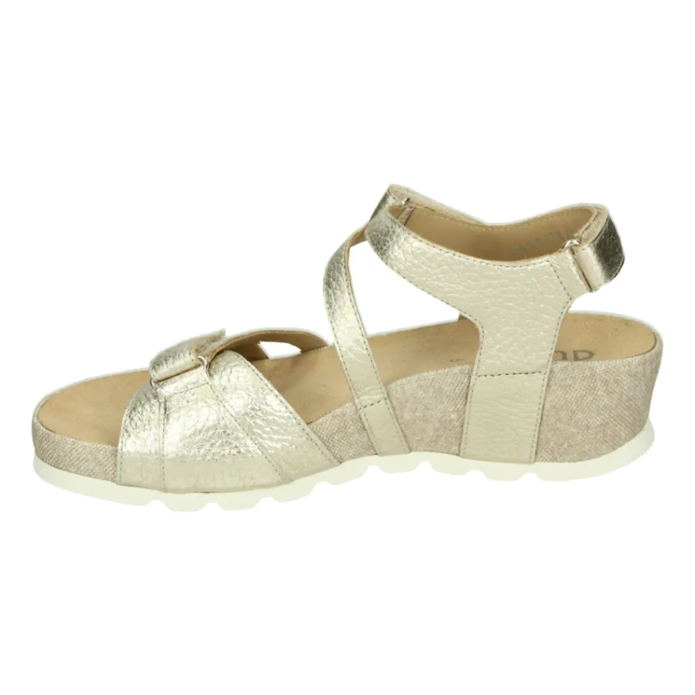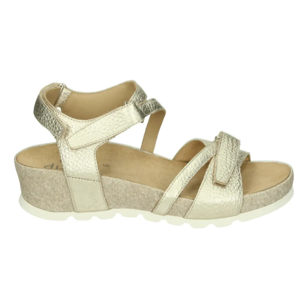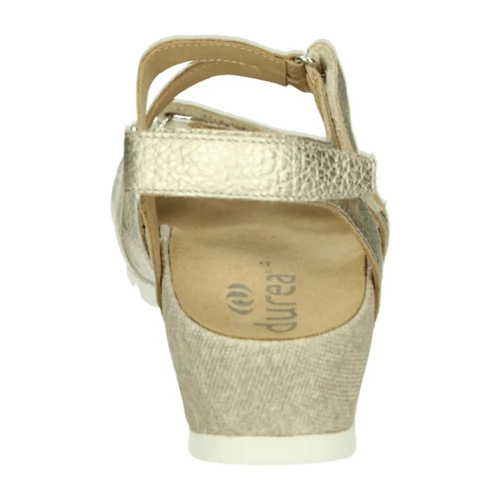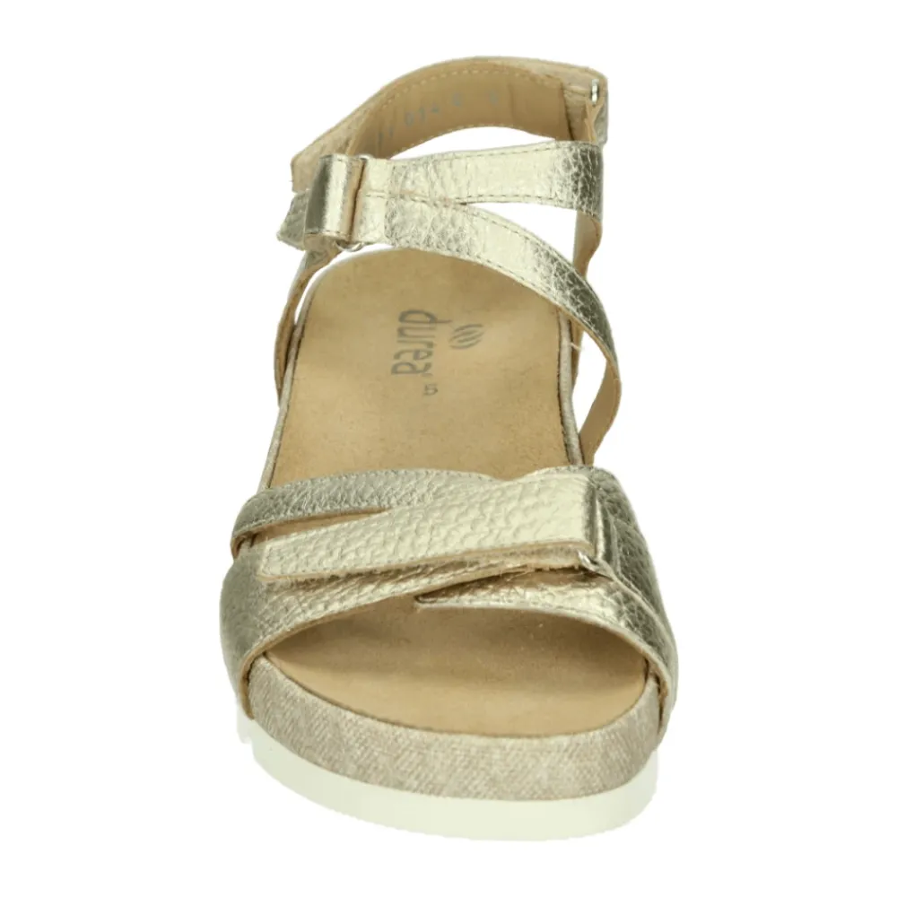 Verrijk je stijl met deze Durea damessandaal in goud. Modelnaam 7421 G, met een G-wijdte en uitneembaar voetbed. Gemaakt van glad leer met een rubberen zool.