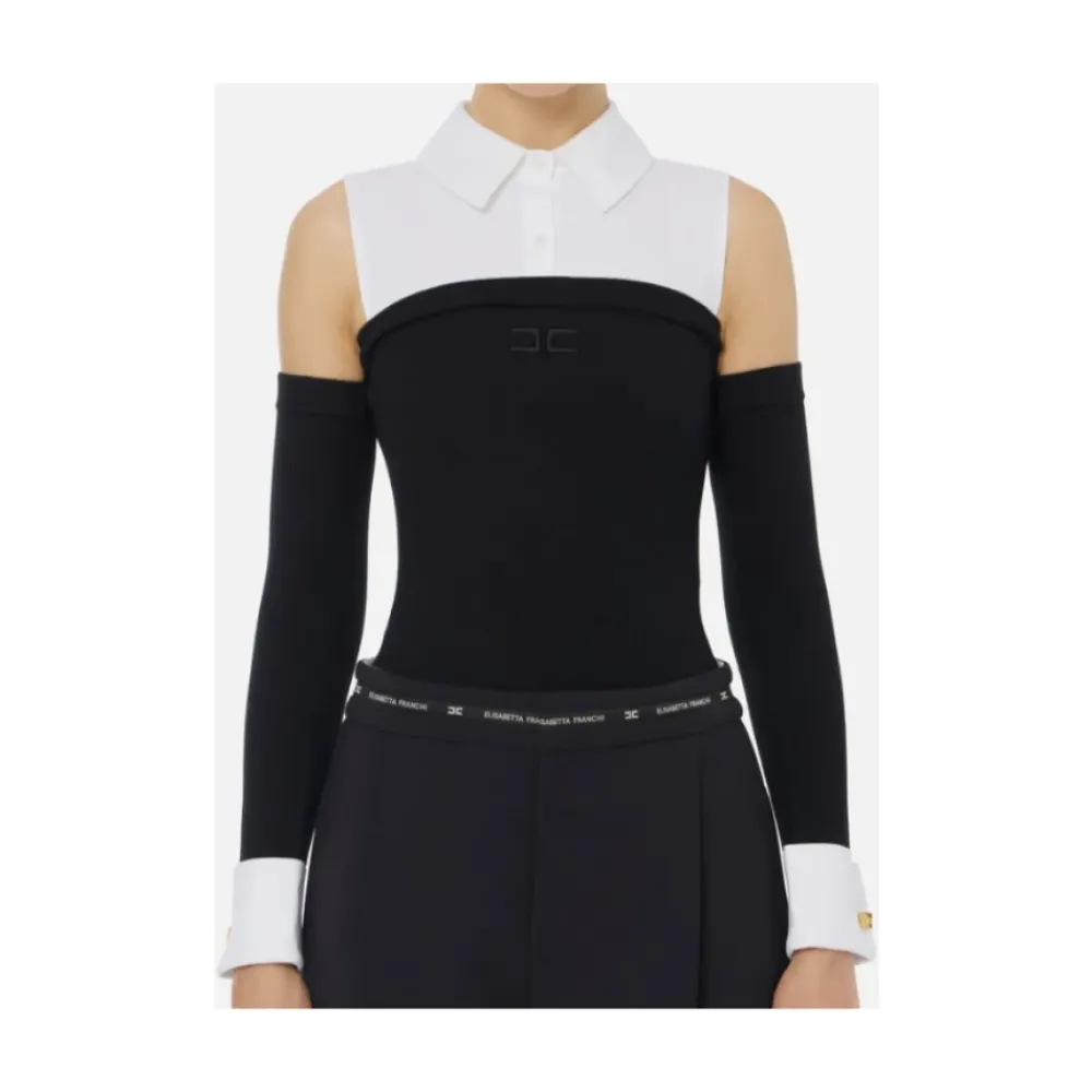Upgrade je stijl met deze Elisabetta Franchi body top, met viscose breisel en katoenen poplin schouders voor een chique overhemdeffect. De klassieke kraag en verborgen knoopsluiting voegen elegantie toe, terwijl de losse mouwen met manchetknopen een unieke touch geven. Afgewerkt met een geborduurd logo, biedt deze top een strakke pasvorm voor een flatterende silhouet. De modellen van Elisabetta Franchi zijn over het algemeen nauwsluitend ontworpen. Als je tussen twee maten in zit, raden wij je aan een maat groter te nemen.
