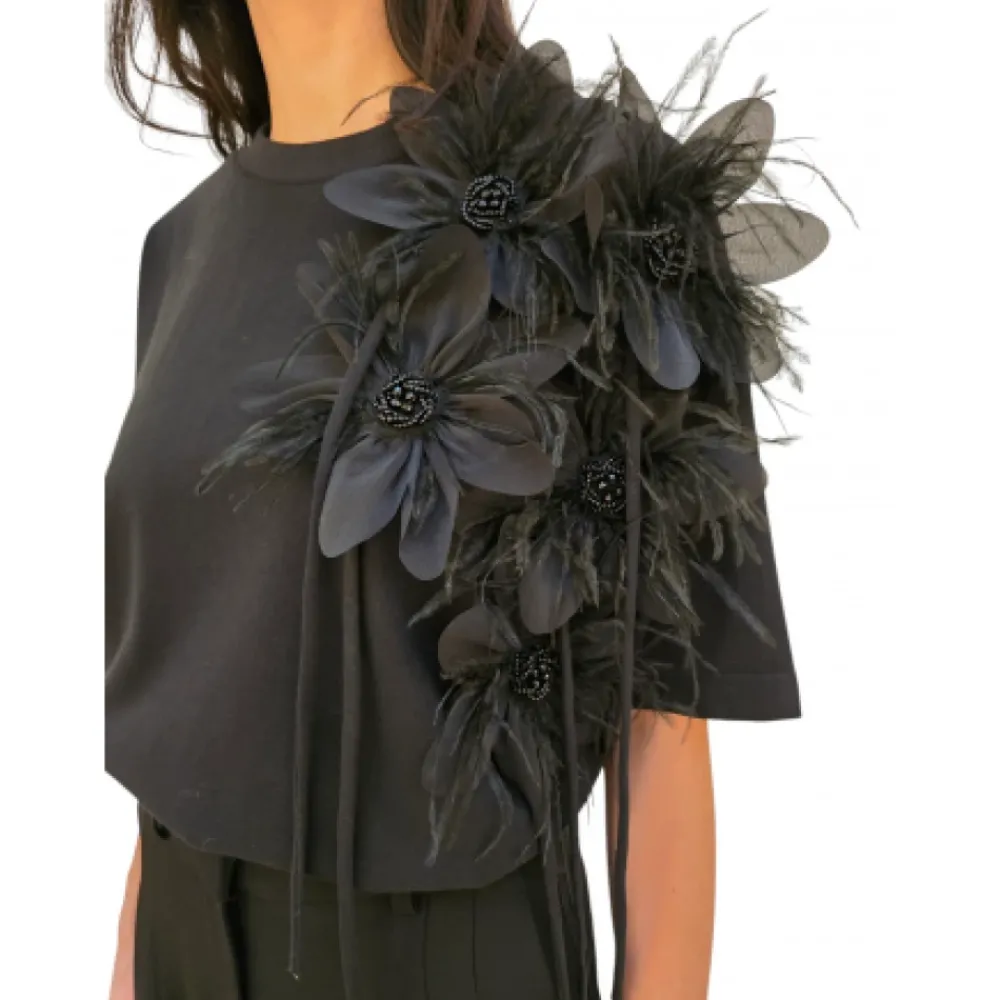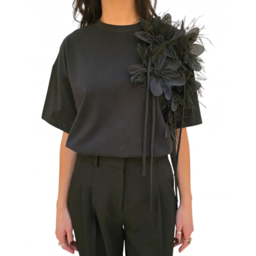 Het Essentiel Antwerp IBISCUS BL34 T-shirt tilt een basis silhouet naar een hoger niveau met een verhoogde bloemmotief en veren, parel- en paillettenversieringen. Draag het met ruwe denim voor een casual-chique look of een satijnen rok voor een meer geklede outfit. Belangrijkste kenmerken: Zwart | Noir | Ronde halslijn | Korte mouwen | Verhoogde bloemenapplicatie | Veren, parels en paillettenversieringen | Afmetingen en pasvorm: Rechte snit | Ronde halslijn voor comfort