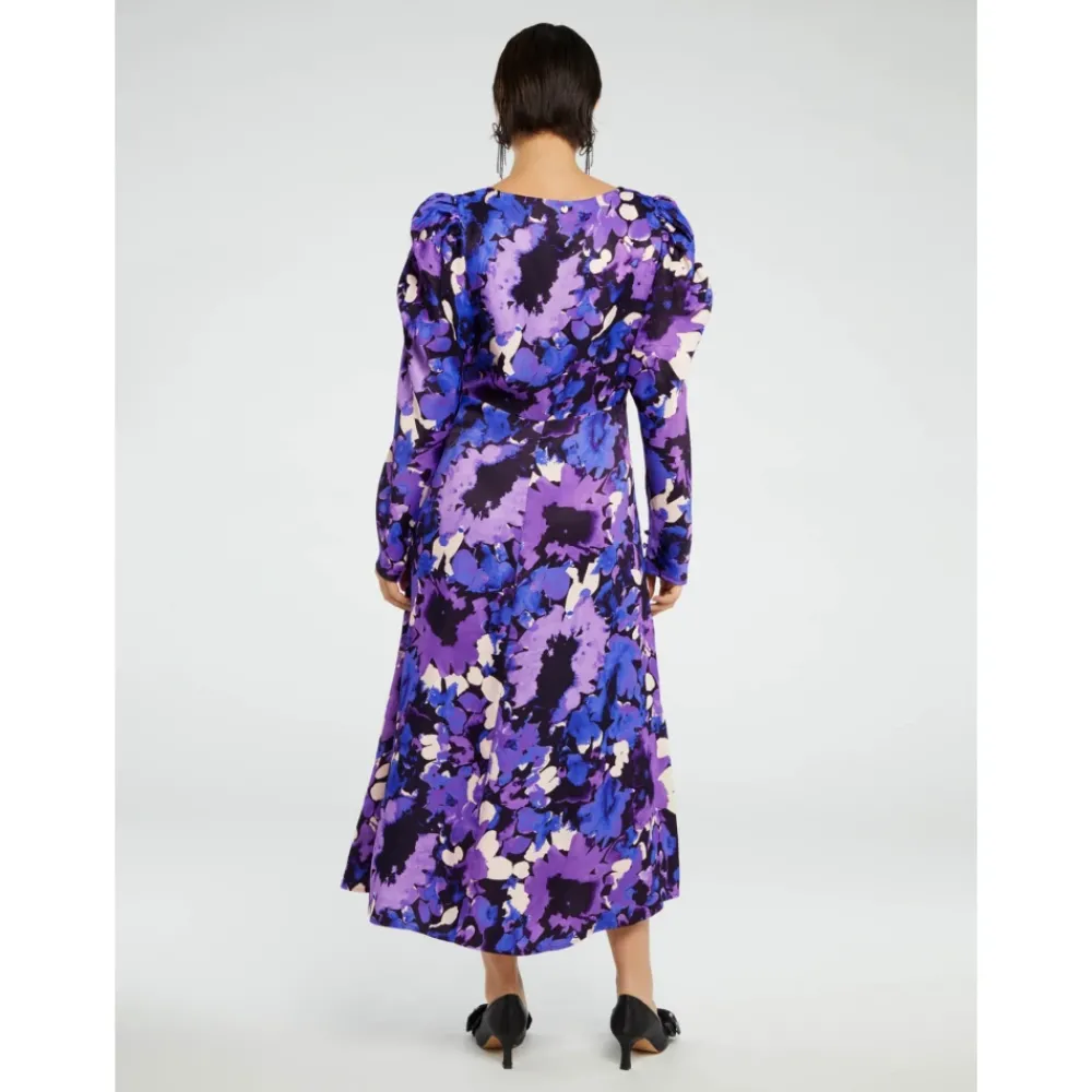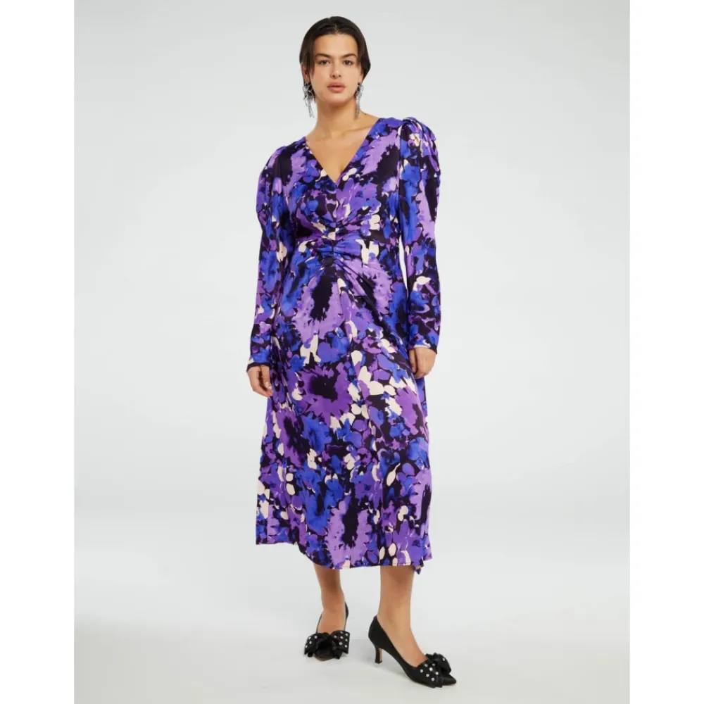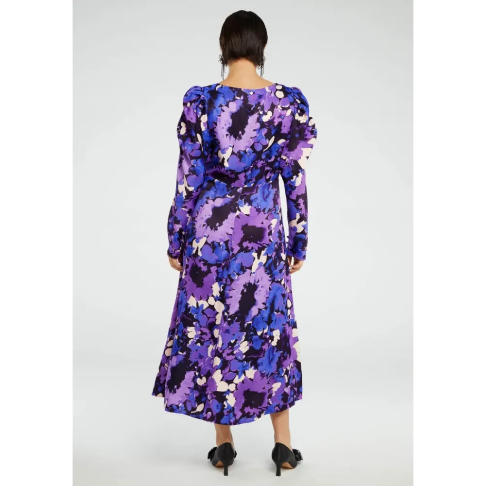 De Vera Jurk van Fabienne Chapot is een stijlvolle midi-jurk met een V-hals en een levendige all-over `Blue Bloomsberry` print, perfect voor zowel overdag als `s avonds. Belangrijkste kenmerken: Paars | Viscose | V-hals | Pofmouwen | Getailleerde taille | Afmetingen en pasvorm: Getailleerde taille | Samenstelling en onderhoud: 100% Viscose