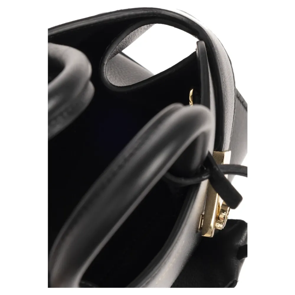 Zwarte ‘Hug Mini’ schoudertas van FERRAGAMO. Gemaakt van kalfsleer, dit ontwerp sluit met magnetische sluitingen en toont decoratieve banden met Gancini-hardware aan de voorkant. Het is compleet met een afneembare en verstelbare schouderriem, twee halfronde handvatten, goudkleurige metalen elementen en één intern compartiment. Hoogte: 17 cm Breedte: 23 cm Model’s Metingen Hoogte: 176 cm Buste: 85 cm Taille: 60 cm Heupen: 89 cm