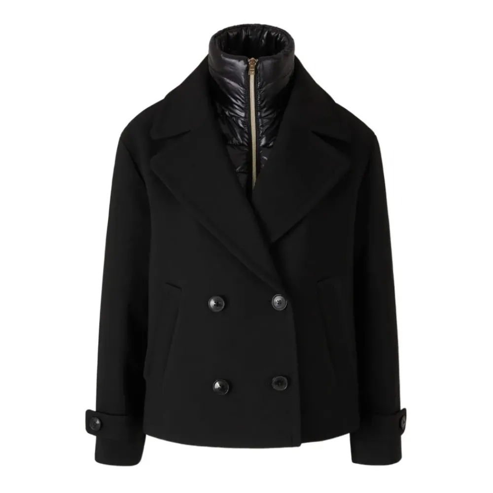 De Herno 2-Layer Scuba en Nylon Ultralichte Peacoat combineert een gestructureerde scuba buitenkant met een verwijderbare Nylon Ultralichte bib voor aanpasbare warmte en weerbestendigheid. Het is ontworpen voor dagelijks gebruik met praktische details en een verfijnd peacoat silhouet. Belangrijkste kenmerken: Zwart | Polyester | Waterafstotende behandeling | Verwijderbare gewatteerde bib | Rits- en knoopsluiting | Zijdelingse paspelzakken | Manchetten met lipje | Reverskraag | Peacoat silhouet | Lange mouwen | Afmetingen & pasvorm: Regular fit | Samenstelling & verzorging: Hoofdstof (buitenkant): 100% polyester | Hoofdstof (binnenkant): 100% polyester | Secundaire stof: 100% polyamide (nylon) | Voering: 100% polyamide (nylon) | Vulling (vezel): 100% polyamide (nylon)