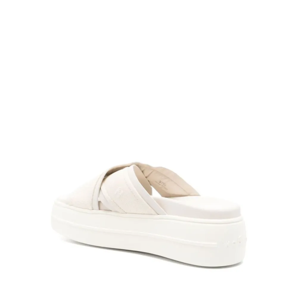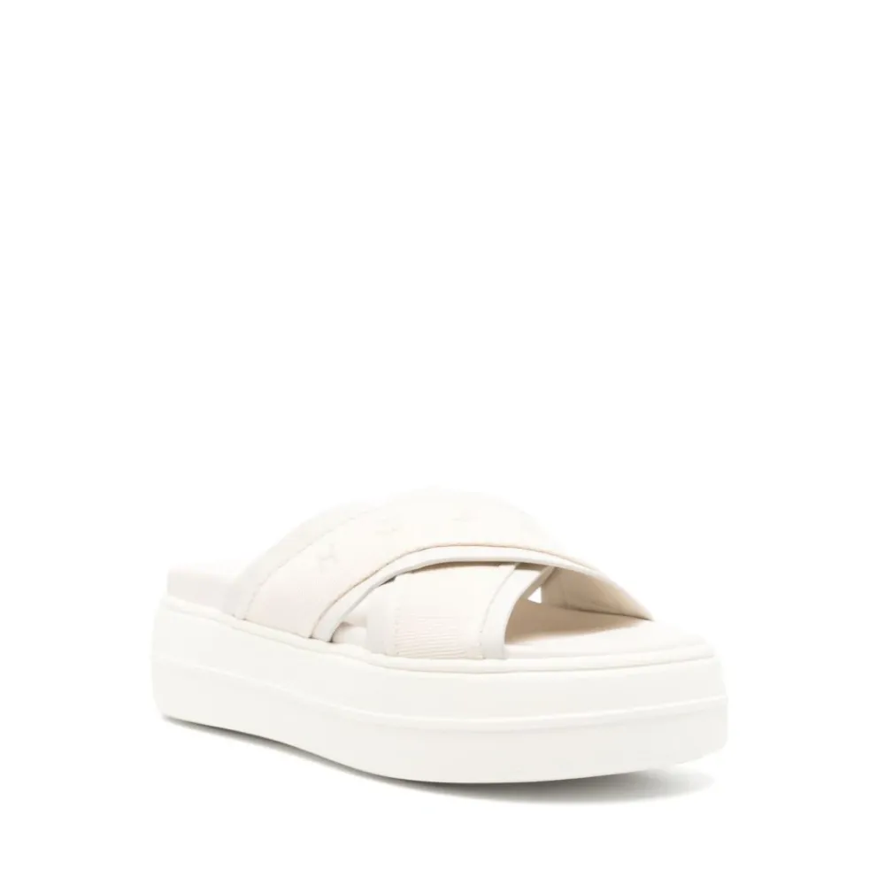 Hogan Skyscraper Sandalen combineren een hoge plateauzool met gekruiste nappa leren bandjes voor een urban-chique, alledaagse sandaal met extra hoogte en comfort. Belangrijkste kenmerken: Wit | Nappa leer | Lichtgewicht EVA zool | Anatomisch leren binnenzool | Stoffen zak inbegrepen | Leren voering | Hoge plateauzool | Grosgrain lint met jacquard logo | Twee gekruiste bandjes | Afmetingen en pasvorm: Totale hoogte: 6 cm | Valt normaal qua maat | Samenstelling en verzorging: Bovenkant: Nappa leer en textielvezels | Voering: Leer | Zool: EVA | Onderhouds- en verzorgingskaarten inbegrepen.