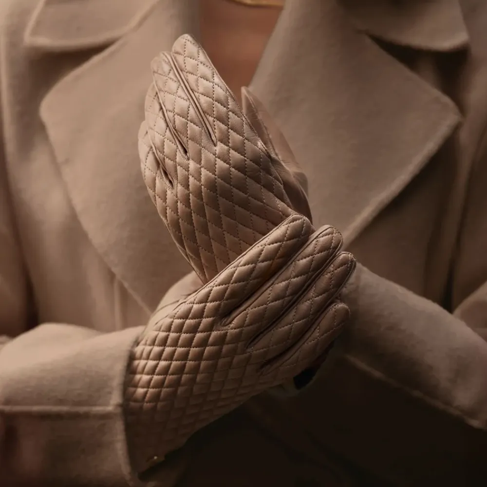 “Stijl en kwaliteit komen samen in Honoré Rosette Geitenleer Handschoenen van Isabel Bernard, uitgevoerd in Taupe.”