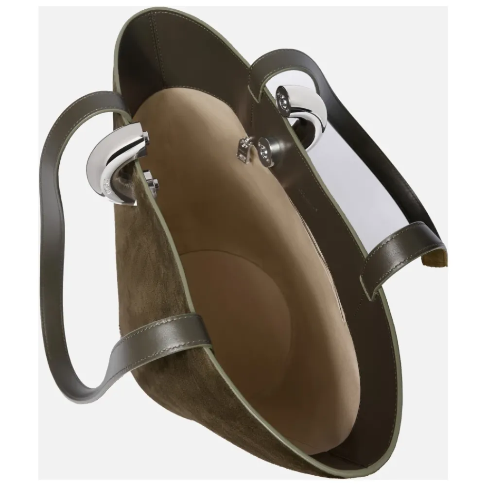 De Jacquemus Borsa secchiello asimmetrica combineert een asymmetrisch suède bucket silhouet met praktische draagopties voor dagelijks gebruik. Het heeft dubbele handvatten en een afneembare schouderriem voor veelzijdig gebruik. Belangrijkste kenmerken: Groen | Suède | Dubbele handvatten | Afneembare schouderriem | Ring sluiting | Met katoen gevoerde binnenkant | Binnenzak met ritssluiting | Veelzijdige draagopties | Asymmetrisch bucket silhouet | Zilveren metalen details | Suède afwerking | Afmetingen: 41 × 34,5 × 19 cm | Samenstelling en onderhoud: Suède | Katoen (voering)