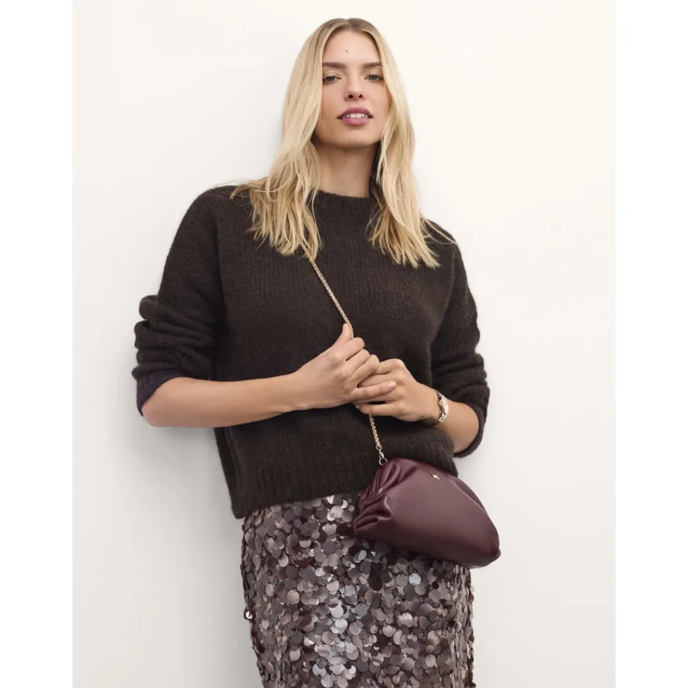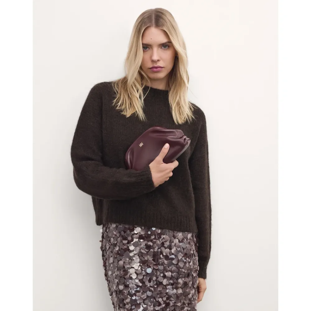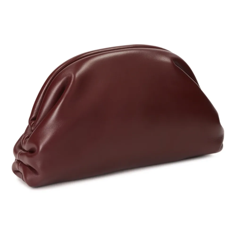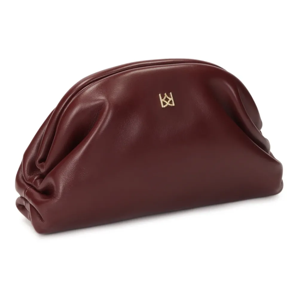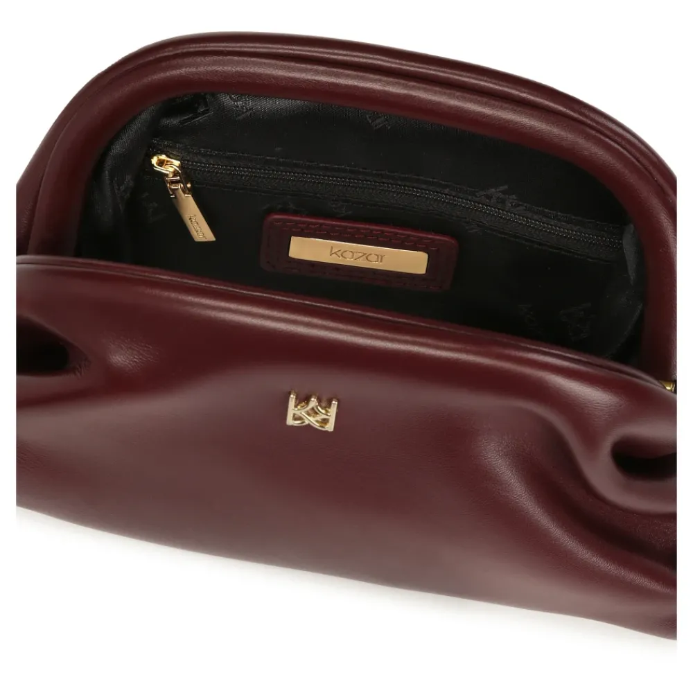 Een kleine avondhandtas gemaakt van hoogwaardig natuurlijk leer in een nobele tint van diep donkerrood verrast met zijn eenvoudige vorm en luxueuze afwerking. Het zachte, licht gekreukelde ontwerp past prachtig in de hand, en de elegante metalen frame sluiting voegt een klassiek tintje toe. Een subtiel gouden logo aan de voorkant is een verfijnde accent dat perfect aansluit bij het minimalistische ontwerp. Ideaal voor speciale gelegenheden, het zal chique avondoutfits perfect accentueren. Productdetails: De handtas heeft 1 compartiment gesloten met een metalen frame. Binnenin zit 1 ritszak.