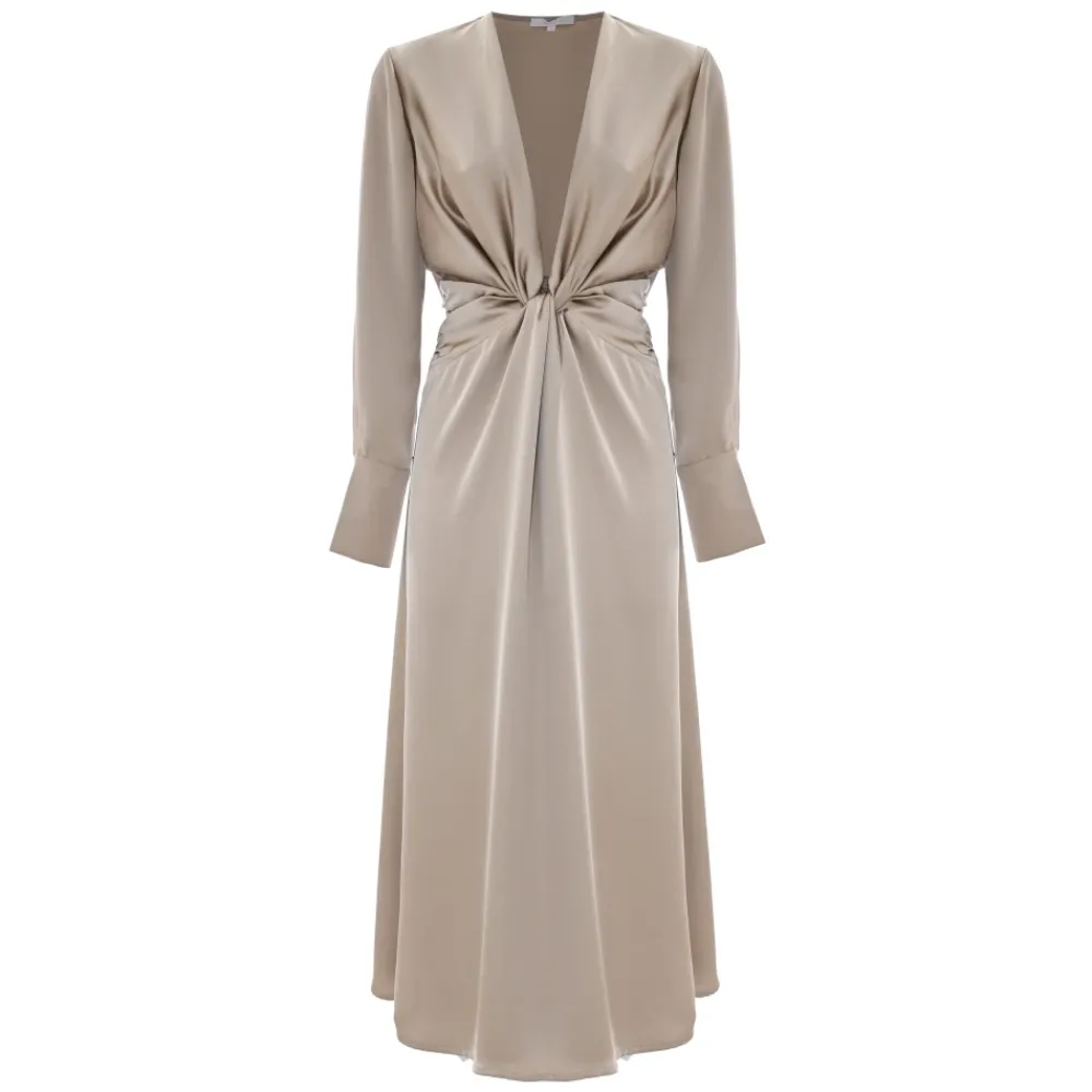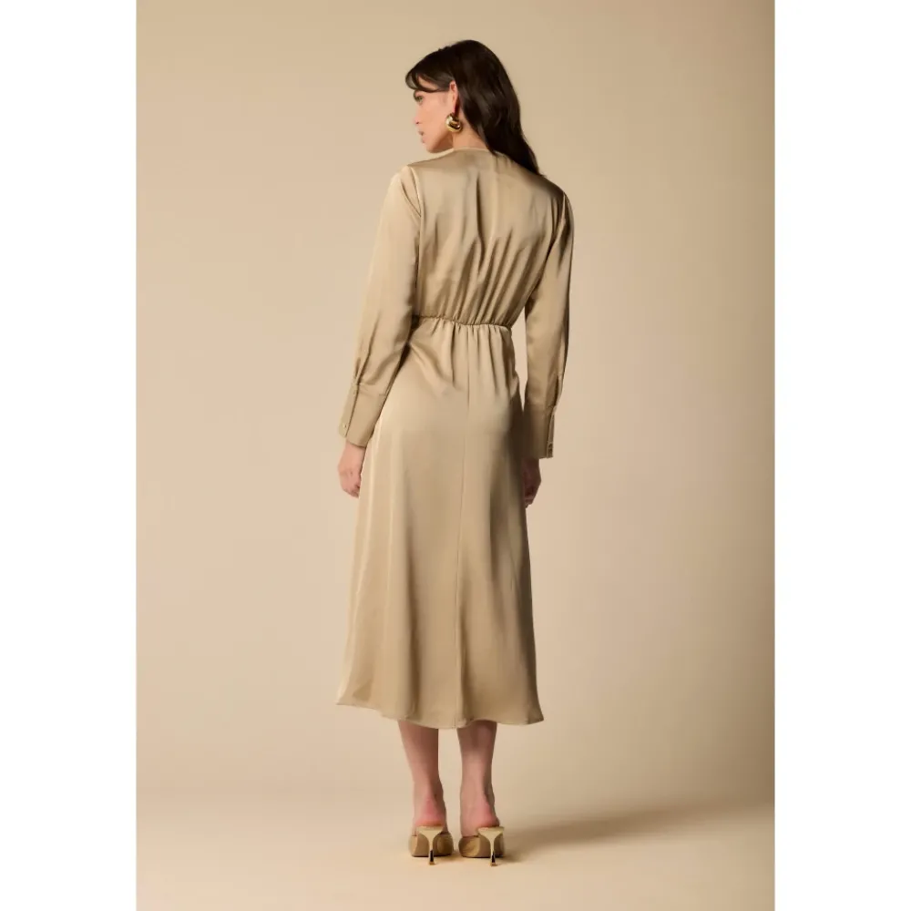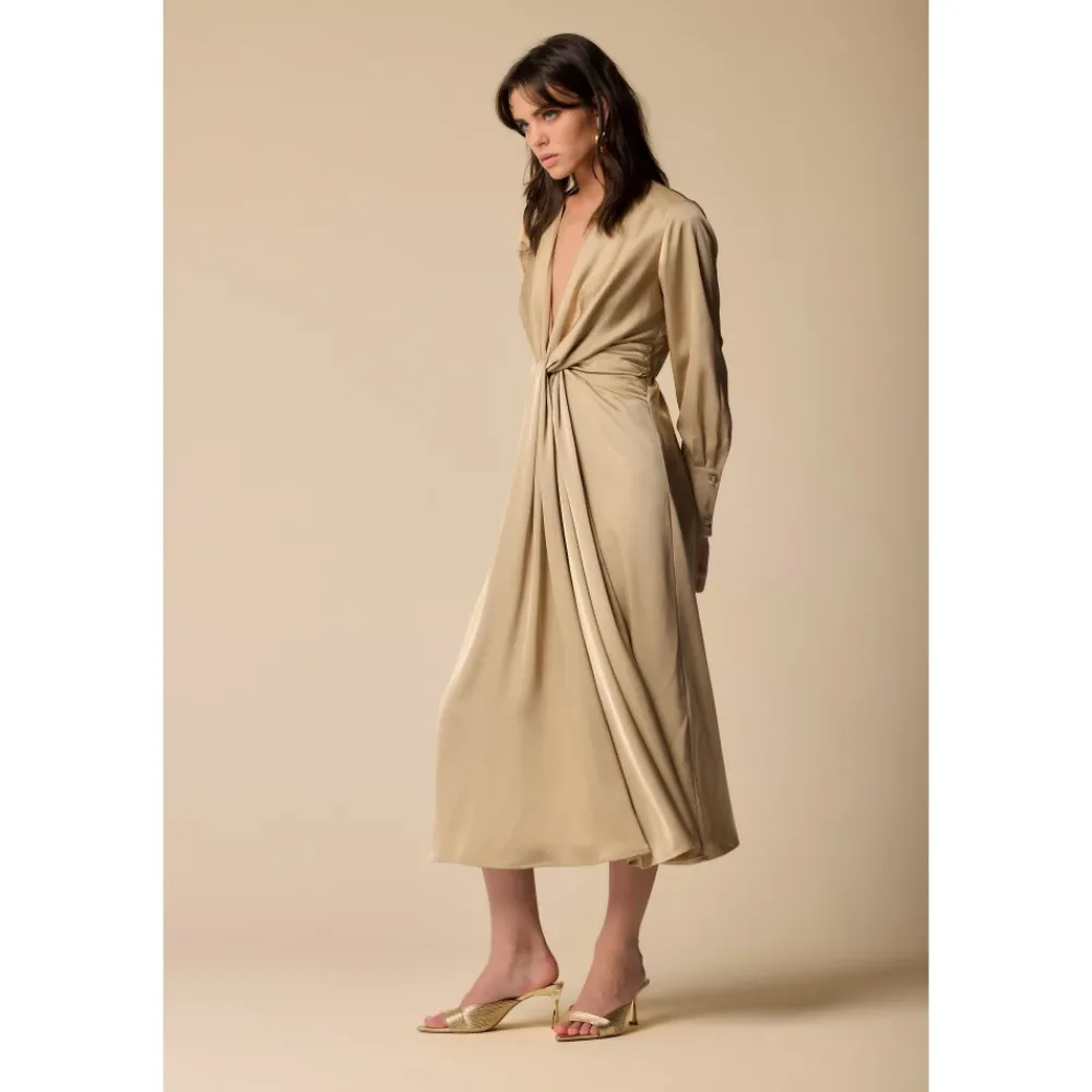 Ontdek de elegante Midi-jurk met gedrapeerde taille van Kocca, met een verfijnde V-hals en zachte draperie aan de taille voor een flatterend silhouet. Belangrijkste kenmerken: Bruin | V-hals | lange mouwen met dubbele knoopmanchetten | zachte draperie aan de taille | Afmetingen en pasvorm: getailleerde lijn |