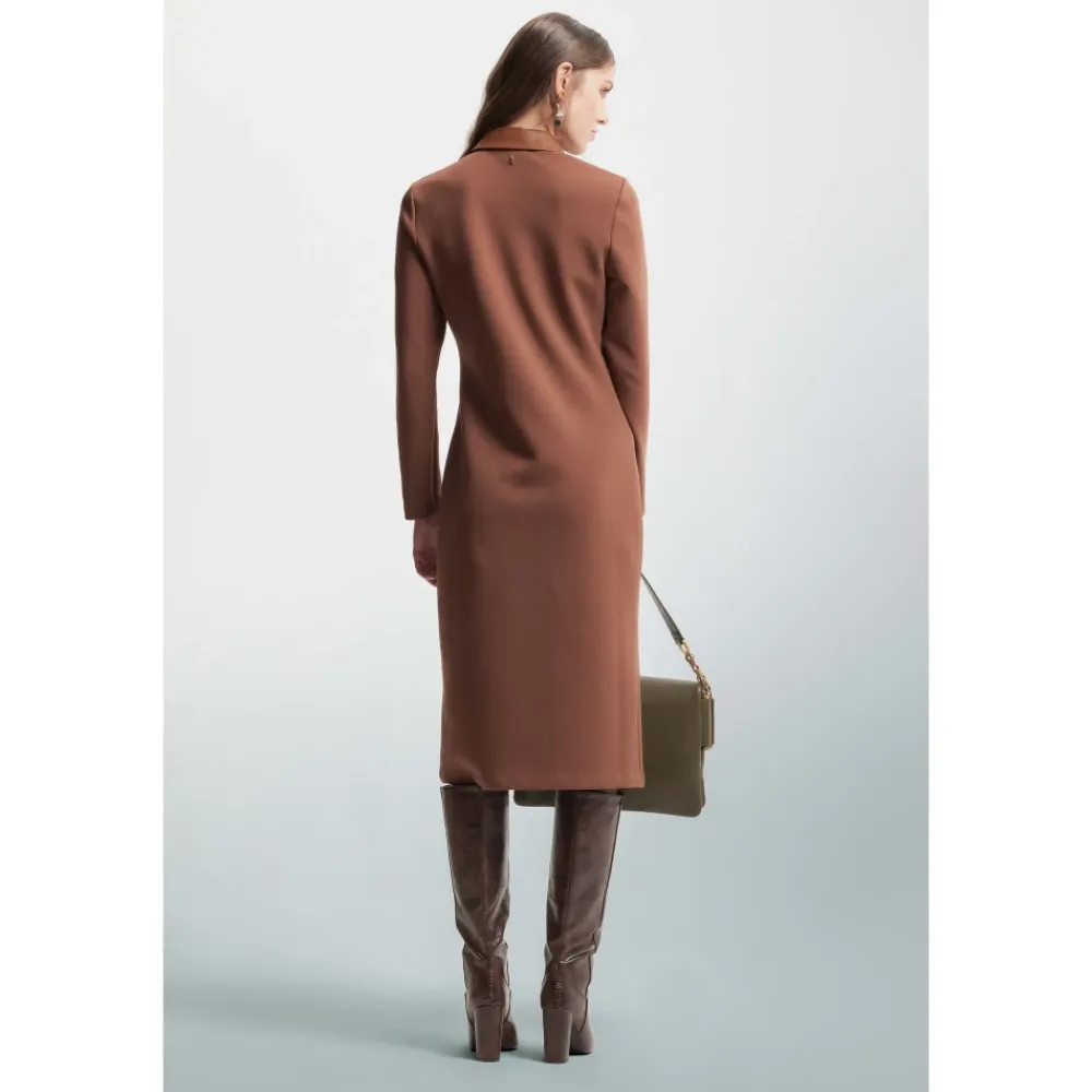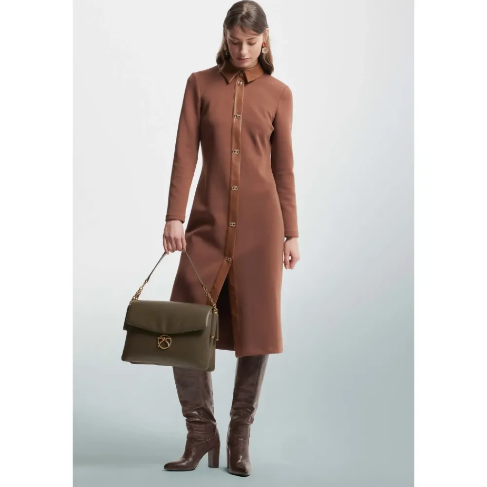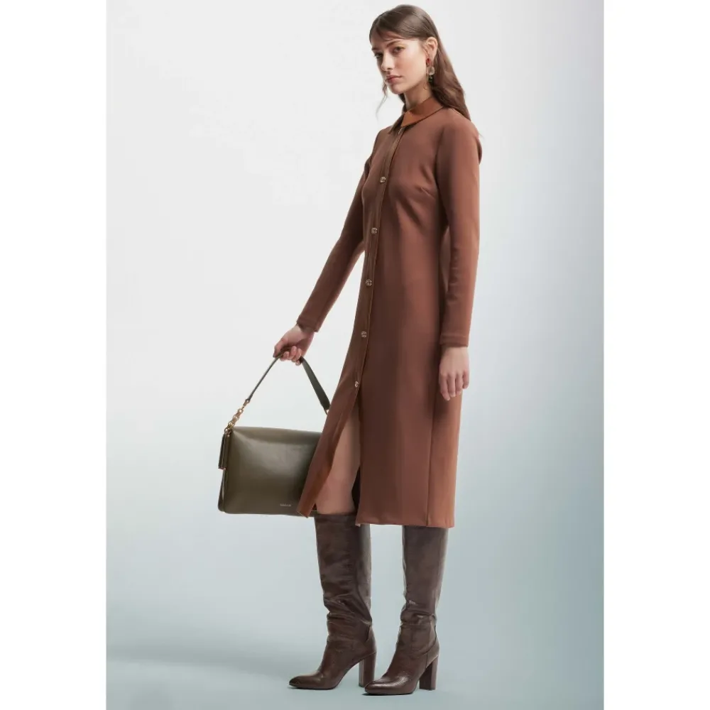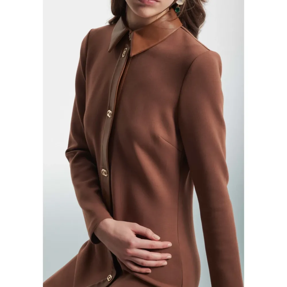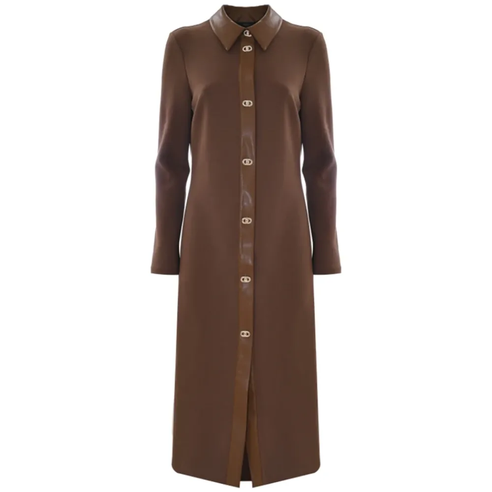 De Kocca Verfijnde overhemdjurk met metalen knopen is een stijlvolle toevoeging aan elke garderobe, met strakke minimalistische lijnen en een rand van imitatieleer voor een vleugje elegantie. Belangrijkste kenmerken: Bruin | metalen knopen | rand van imitatieleer | rechte en strakke minimalistische lijnen | Afmetingen en pasvorm: rechte pasvorm |