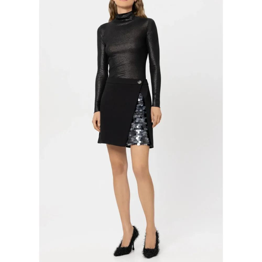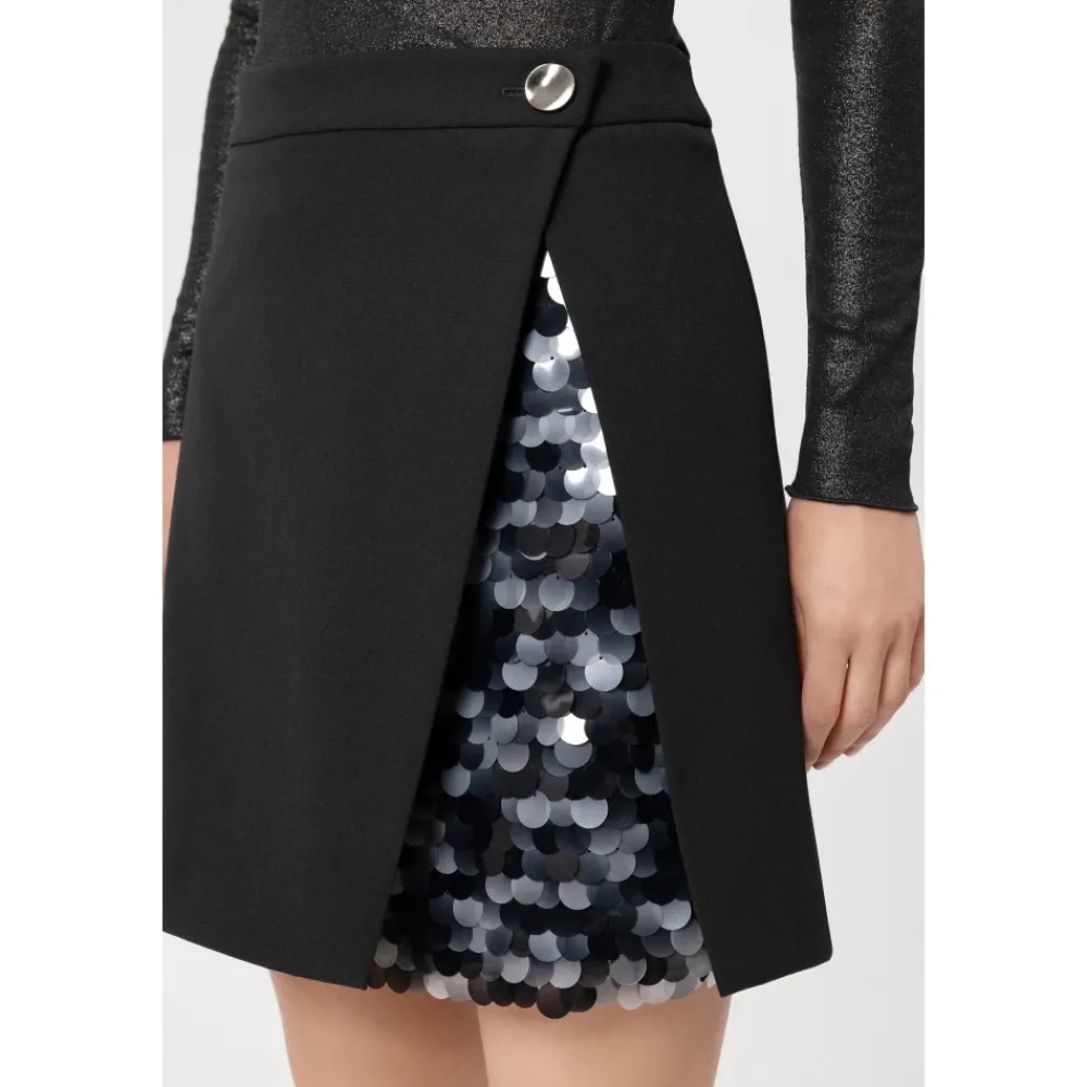 De Luisa Cerano minirok met wikkeleffect combineert een silhouet in wikkelstijl met een met pailletten versierde voering aan de voorkant voor een verfijnde, blikvangende afwerking. Ideaal voor avond- en feestlooks. Belangrijkste kenmerken: Zwart | Polyester | Bi-elastisch (stretch) | Zijknopensluiting | Wikkeleffect (wikkellook) | Voering aan de voorkant versierd met pailletten | Mini-lengte | Afmetingen & pasvorm: Lengte (standaard): 45 cm | Lengte (lang): 56 cm | Modelhoogte: 178 cm; draagt maat 36 | Samenstelling & onderhoud: Buitenlaag: 64% polyester, 27% viscose, 9% elastaan | Voering: 57% viscose, 43% polyester | Pailletten: Plastic | Handwas