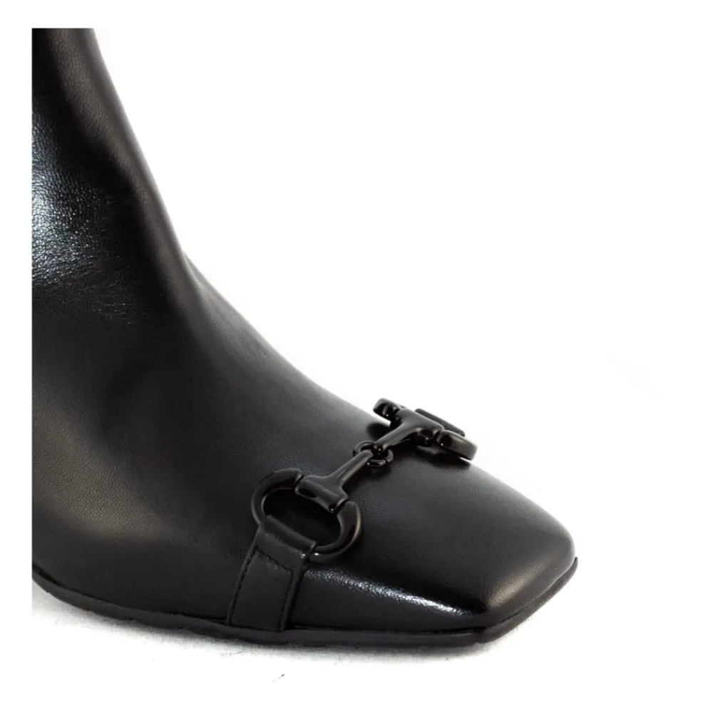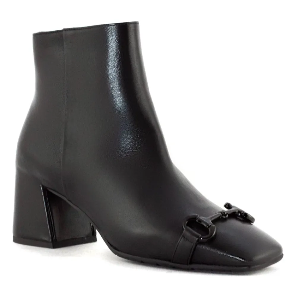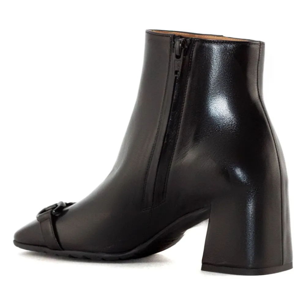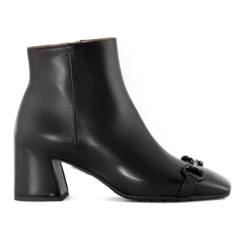 Verrijk je stijl met deze Mara Bini zwarte leren enkellaarzen. Met glad leer, een taps toelopende en slanke neus, toon-op-toon gespdetail aan de voorkant, zijrits en een comfortabele hakhoogte van 5,5 cm.