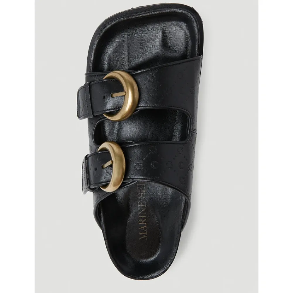 Stap in stijl met deze Marine Serre sliders, gemaakt van glad generfd leer. Met een vierkante open teen en een zijdelingse gespsluiting zorgen deze sandalen voor een stevige pasvorm en bieden ze een vleugje elegantie met hun grafisch reliëfmotief. Belangrijkste kenmerken: Zwart | Leer | Zijdelingse gespsluiting | Gevormd voetbed | Vierkante open teen | Grafisch reliëfmotief | Zijlogo motief | Afmetingen en pasvorm: Normale pasvorm | Samenstelling en onderhoud: 100% Leer