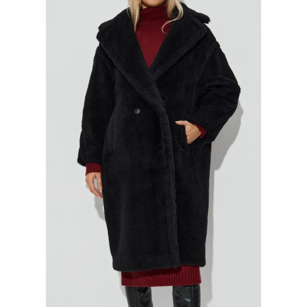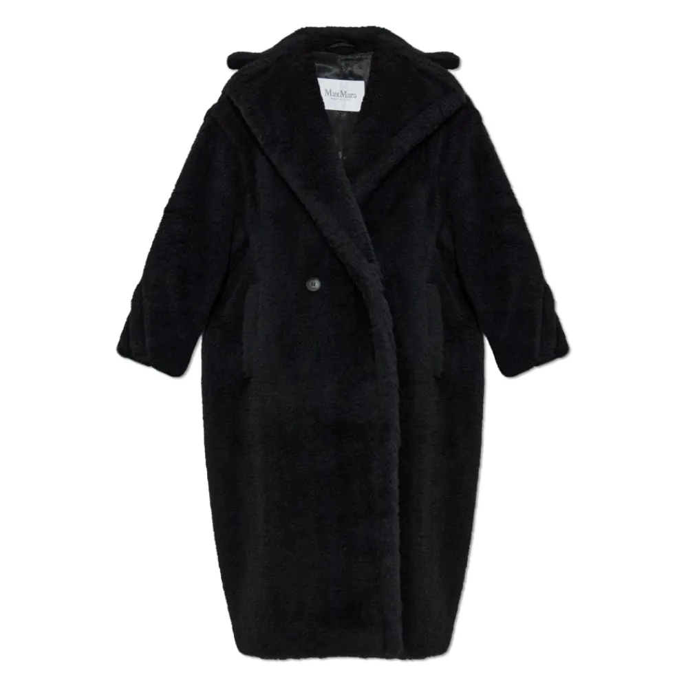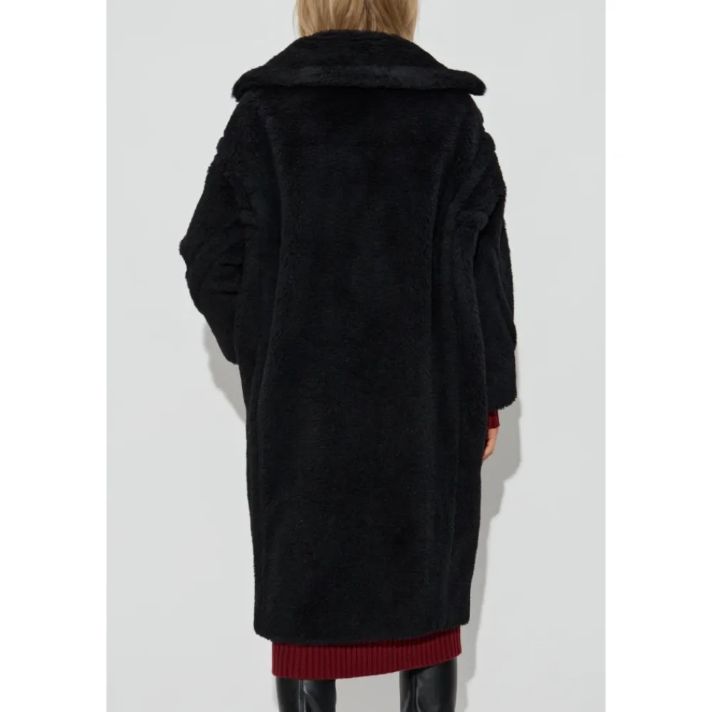 De Max Mara Tedgirl Wollen Jas combineert een zachte teddy textuur met een relaxed, oversized silhouet voor een stijlvolle laag tijdens koude dagen. Belangrijkste kenmerken: Zwart | Alpaca | Zachte teddy textuur | Warme isolerende stof | Dubbelrijige knoopsluiting | Zijsplitzakken | Volledig gevoerd | Hoornen knopen | Oversized silhouet | Grote reverskraag | Wijde, laag ingezette mouwen | Minimalistische gladde afwerking | Knie-/lange lengte | Afmetingen & pasvorm: Lengte: 110 cm | Oversized pasvorm | Verlaagde schouders | Samenstelling & verzorging: 62% alpaca | 26% scheerwol | 12% zijde | Voering: 100% viscose | Professionele stomerij. Niet wassen, bleken, in de droogtrommel of strijken; niet chemisch reinigen; bescherm de knopen voor het reinigen.