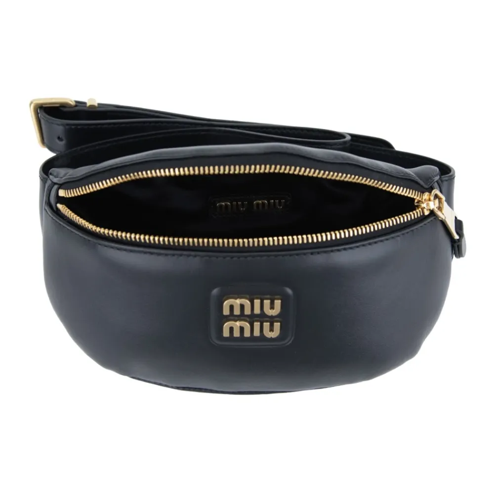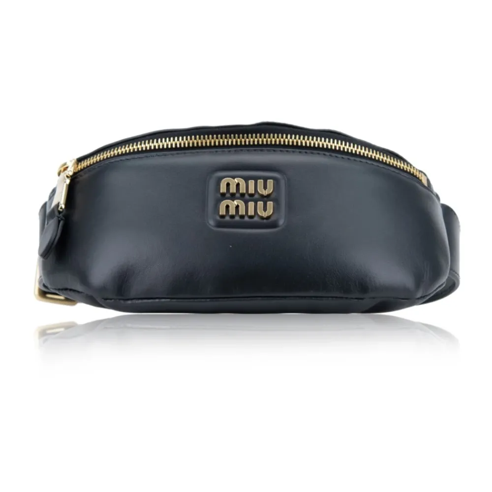 Geef je stijl een boost met deze chique leren heuptas, ontworpen door Miu Miu. Met een strakke zwarte afwerking en goudkleurige metalen accenten, is dit accessoire perfect om een vleugje luxe toe te voegen aan elke outfit. Belangrijkste kenmerken: Zwart | Leer | Verstelbare leren schouderriem | Goudkleurige metalen merkletters | Mini envelopzak op de achterkant | Afmetingen en pasvorm: B21.5cm x H11cm x D7.5cm |