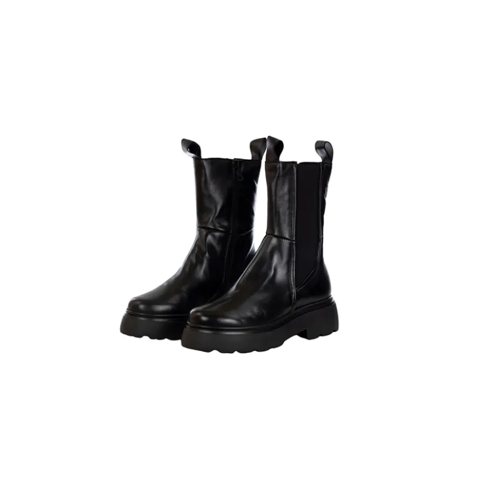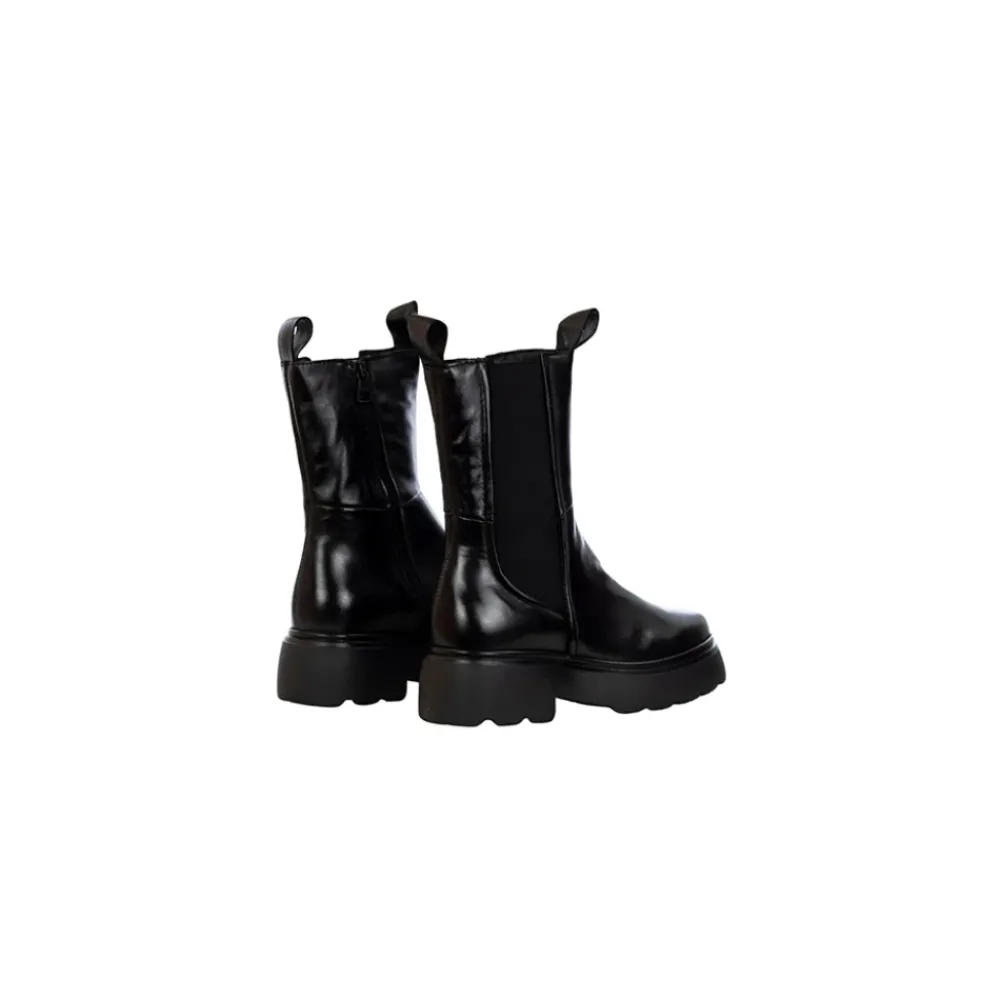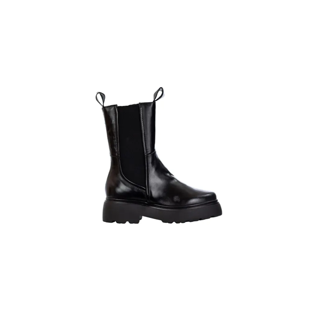 Upgrade je stijl met deze Mjus Chelsea-laarzen in zwart leer met stretchstof inzetstukken aan de zijkanten. Met een hak van 50 mm, een plateau van 30 mm en een rubberen zool. Normale pasvorm.