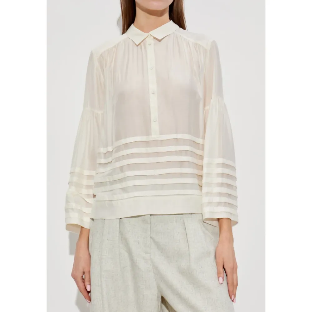 Munthe Rosalin Shirt combineert Scandinavische elegantie met artistieke, gestreepte details in een ietwat oversized, semi-transparant silhouet. Het is ontworpen voor veelzijdige, smart-casual kleding, met een verborgen sluiting en gebeeldhouwde schouderplooien. Belangrijkste kenmerken: Beige | Crème | Viscose | Zacht gevoel | Semi-transparante stof | Verborgen knoopsluiting | Wijde 7/8 mouwen | Klassieke kraag | Horizontale strepen | Brede designerbanden aan de zoom (voor- en achterkant) | Geplooide schouders | Subtiele glans | Afmetingen & pasvorm: Lengte model: 177 cm | Borstomvang model: 83 cm | Taille model: 61 cm | Heupomvang model: 89 cm | Model draagt maat: 36 | Ietwat oversized pasvorm | Samenstelling & verzorging: Viscose | Zijde