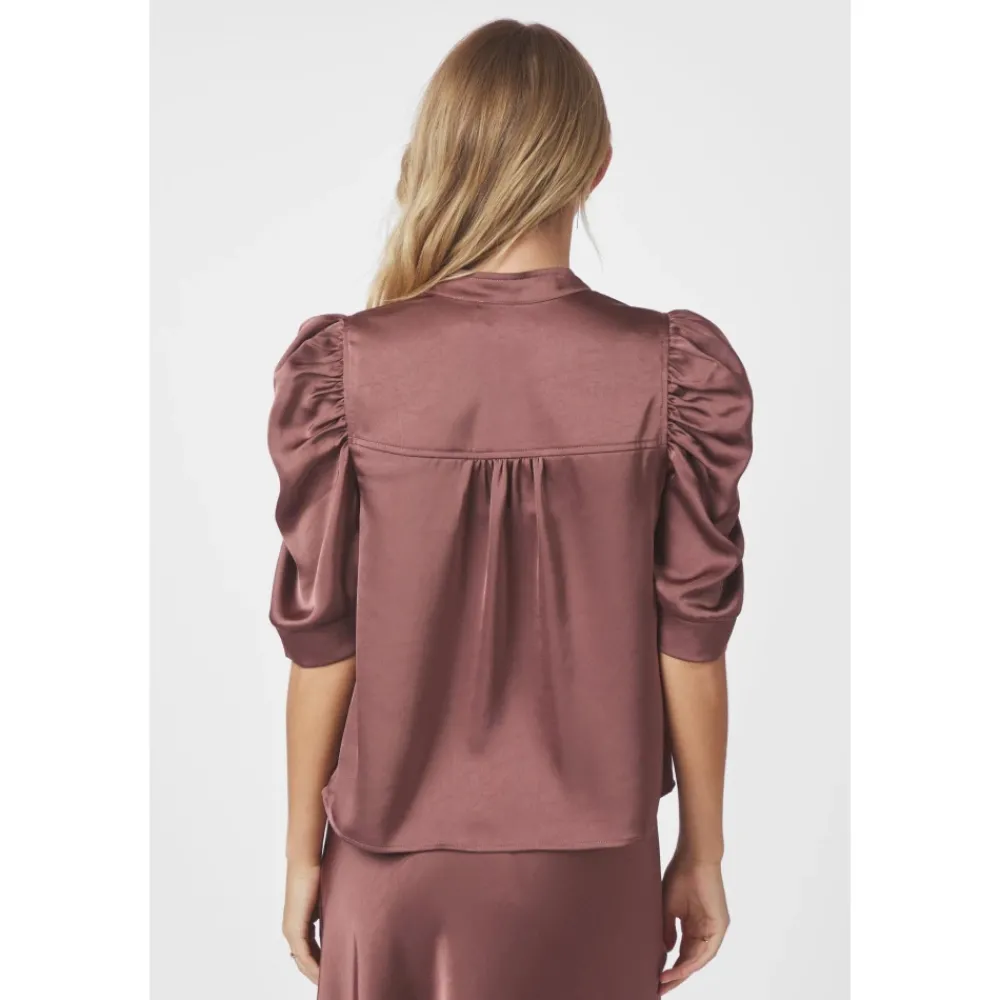 Vrouwelijke blouse van Neo Noir met korte pofmouwen, v-halslijn en prachtige satijnkwaliteit. Pasvorm: Normaal. Afmetingen: Maat 34: Borst: 47 cm x 2. Lengte: 58 cm. Model: Roella Hearvy Sateen Blouse 162590 Dark Rose. Materiaal: 97% polyester, 3% elastaan. Wasvoorschrift: Machinewas op 30 graden.