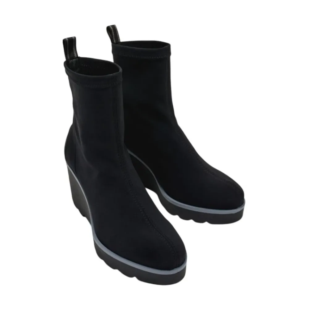 De Pedro Miralles Hita Wedge Enkellaars combineert een waterafstotend, suède-achtig elastisch bovenwerk met een gekartelde sleehak van 7 cm voor stabiel, comfortabel dagelijks gebruik. Belangrijkste kenmerken: Zwart | Negro | Elastische stof (suède-achtig) | Waterafstotend | Flexibel bovenwerk voor een nauwsluitende pasvorm | Treklus aan de achterkant voor gemakkelijk aan- en uittrekken | Gekartelde sleehakzool | 2 cm platform | Tijdloos, minimalistisch silhouet | Treklus aan de achterkant | Afmetingen en pasvorm: Schachthoogte: 25 cm | Hakhoogte: 7 cm | Platformhoogte: 2 cm | Flexibel elastisch bovenwerk zorgt voor een nauwsluitende, sokachtige pasvorm. | Samenstelling en verzorging: Elastische stof (waterafstotend, suède-achtig)