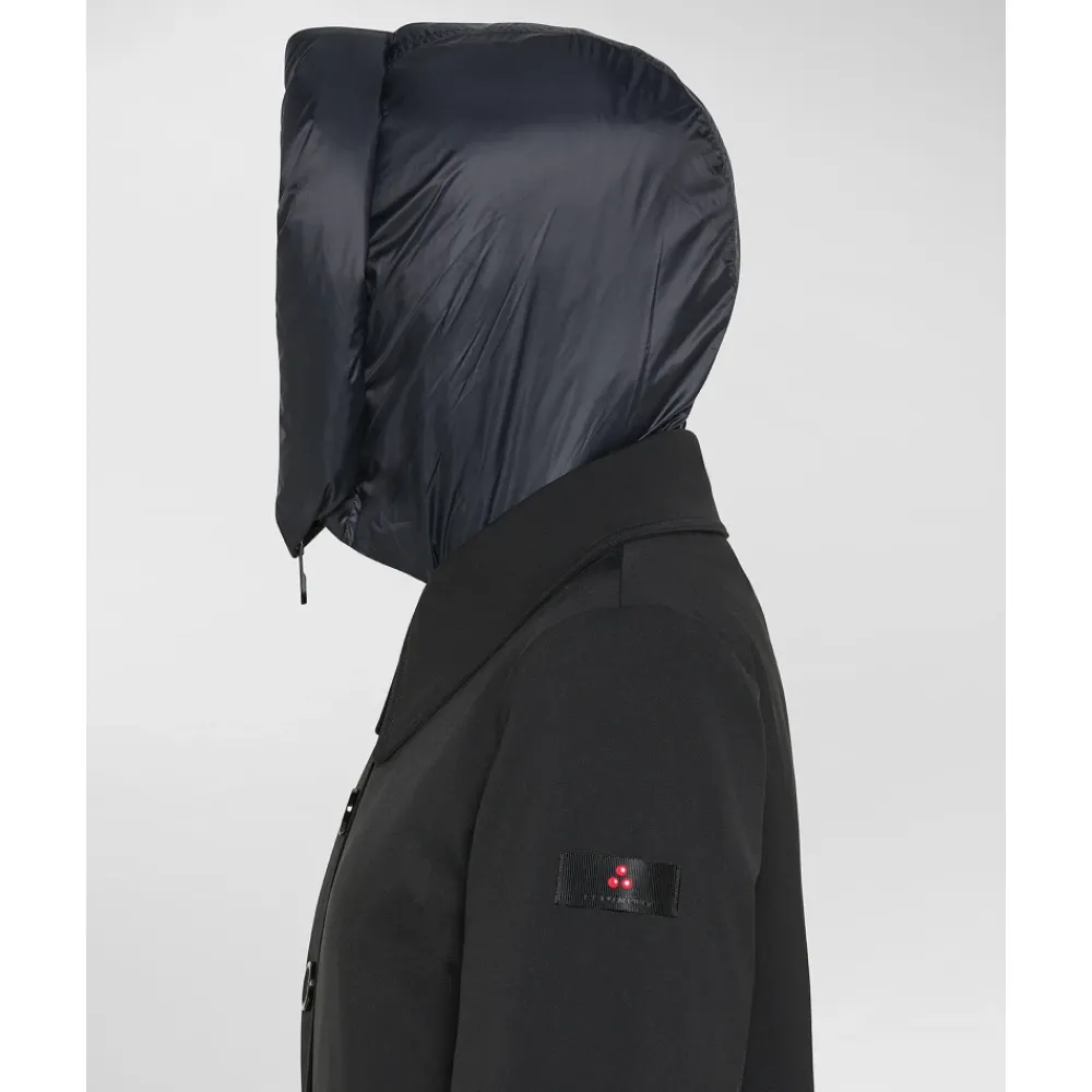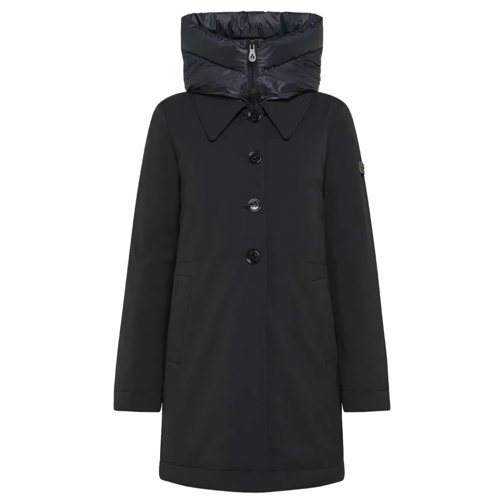 Elegante jas met klassieke kraag en stoffen knopen in stretch nylon met keperstructuur, schone en matte uitstraling. Het licht gecoate materiaal is zacht maar , verbetert de veerretentie en biedt waterafstotende en winddichte eigenschappen. Brede kraag en capuchon voor een gedurfde en eigentijdse stijl. Voorzien van een volledige centrale rits en onzichtbare zakken in de zijnaad. Gecertificeerde natuurlijke veren vulling. De perfecte bondgenoot voor wie op zoek is naar een elegante maar trendy kledingstuk, geschikt voor elke gelegenheid.