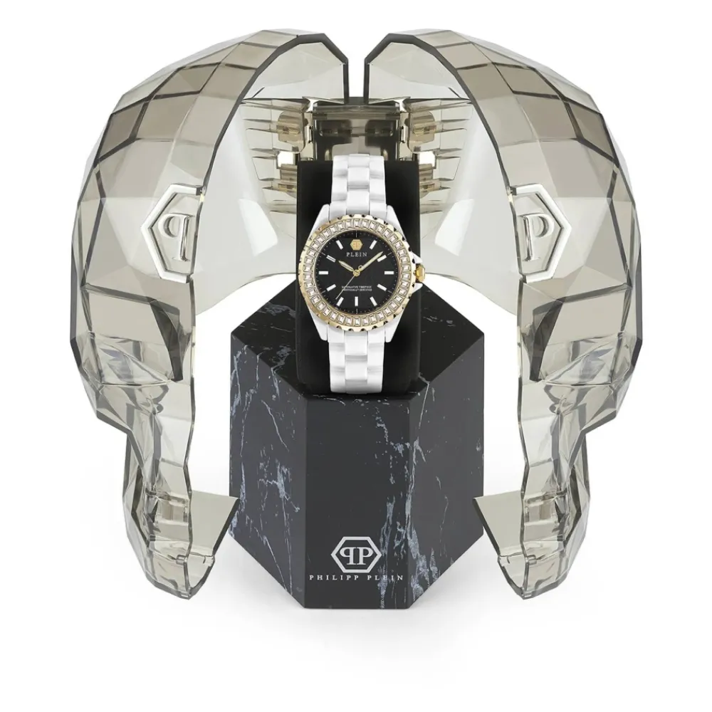 De Philipp Plein Superlative Horloge combineert een witte keramische kast en armband met een zwarte wijzerplaat en een met kristallen bezette kast voor een verfijnde, alledaagse accessoire. Aangedreven door een MIYOTA quartz uurwerk en waterdicht tot 5 ATM, is het gebouwd voor betrouwbaar dagelijks gebruik. Belangrijkste kenmerken: Wit | Zwart | Keramiek | Waterbestendig tot 5 ATM (50 m) | Mineraalglas | Keramische armband | Quartz uurwerk (MIYOTA 2039) | Decoratieve stenen op de kast | Zwarte wijzerplaat | Afmetingen & pasvorm: Diameter kast: 38 mm | Samenstelling & onderhoud: Kast: Keramiek | Armband/schakels: Keramiek | Glas: Mineraalglas | Decoratieve stenen