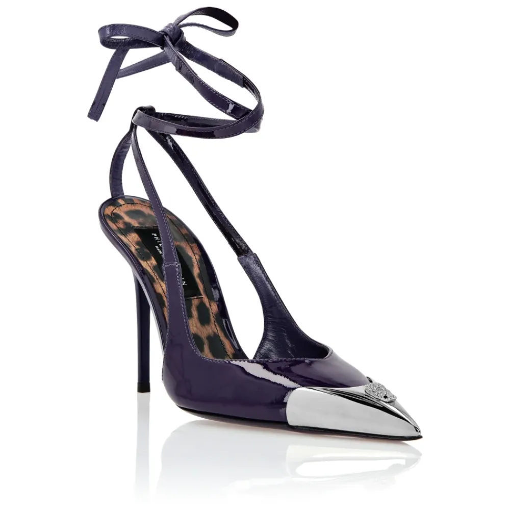 Philipp Plein Patent Leather Decollete Hi-Heels Crystal Skull combineren een glanzende lakleren afwerking met een opvallend juwelen schedel detail voor een elegante avondlook. Het ontwerp combineert twee vetersluiting enkelbandjes met een hoge, gelakte stiletto hak voor een gedurfde, gestructureerde look. Belangrijkste kenmerken: Paars | Kalfsleer | Twee vetersluiting enkelbandjes | Vetersluiting bij de enkel | Lakleren afwerking | Juwelen schedel op metalen neus | Bijpassende gelakte stiletto hak | Hoogglans leren zool | Nappa voering | Afmetingen & pasvorm: Hakhoogte: 10,5 cm | Samenstelling & onderhoud: Bovenkant: 100% kalfsleer | Voering: 100% geitenleer | Binnenzool: 100% kalfsleer | Buitenzool: 100% kalfsleer | Inzetstuk: 100% acrylonitril butadieen styreen (ABS) | Inzetstuk: 100% zink (Zamak)