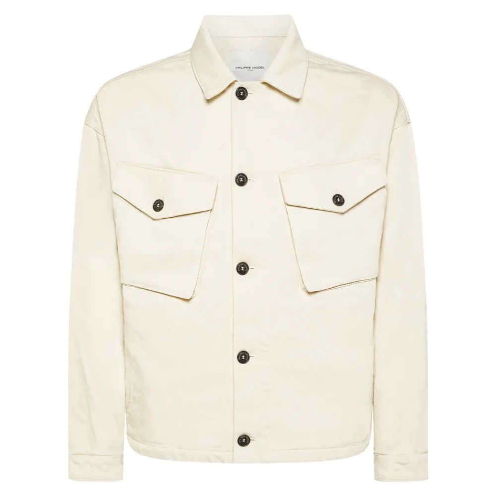 Philippe Model Jacket in Beige | Ecru — een lichtgewicht bull denim jas ontworpen voor de overgangsseizoenen, aangeboden in een 12 oz gewicht voor comfortabele, dagelijkse laagjes. Belangrijkste kenmerken: Beige | Ecru | Bull denim | 12 oz gewicht | Lichtgewicht jas silhouet | Bull denim textuur | Zwarte reactieve verfvariant beschikbaar | Afmetingen & pasvorm: Model is 1.75 m en draagt maat 40. | Samenstelling & verzorging: 100% katoen | Machinewas koud, fijne was. Niet bleken. Strijk op lage temperatuur. Niet in de droger.