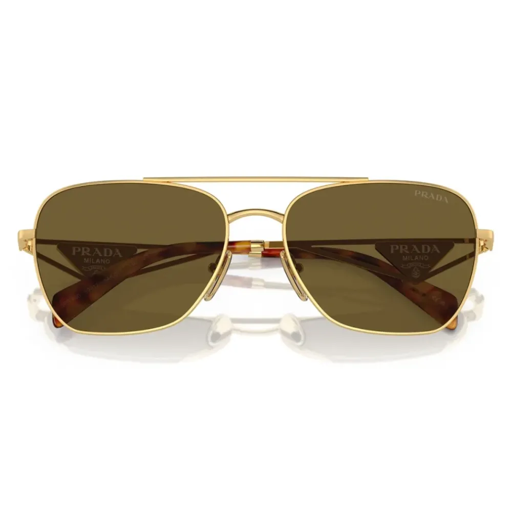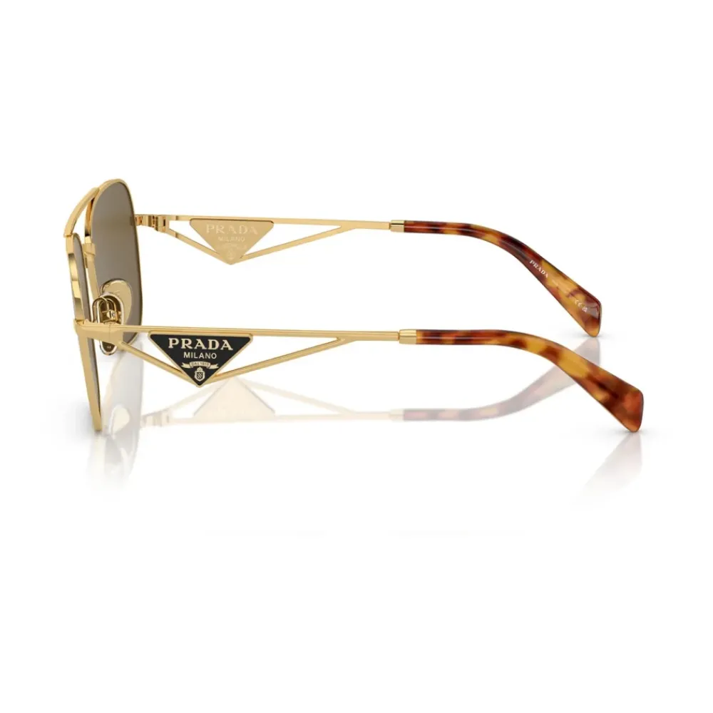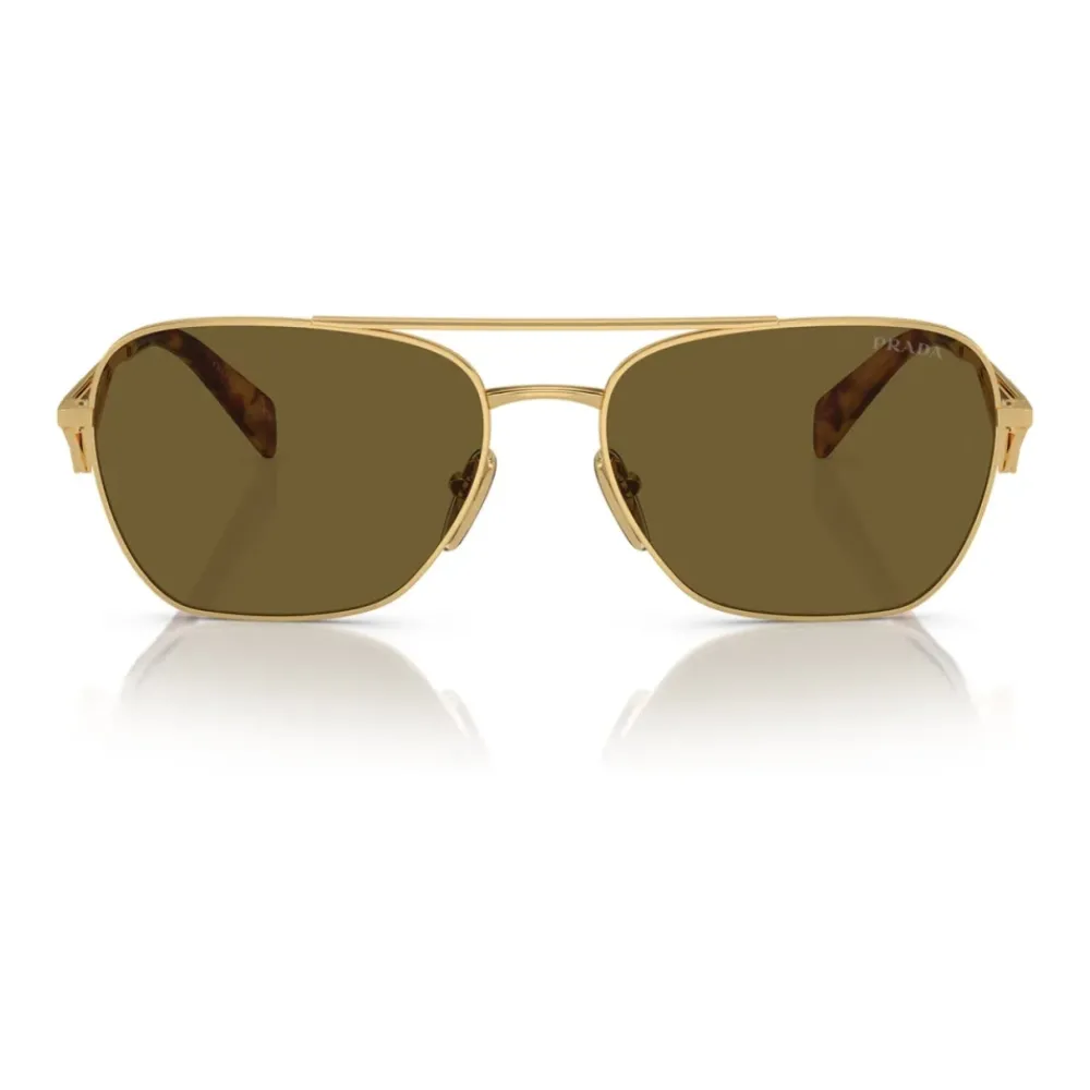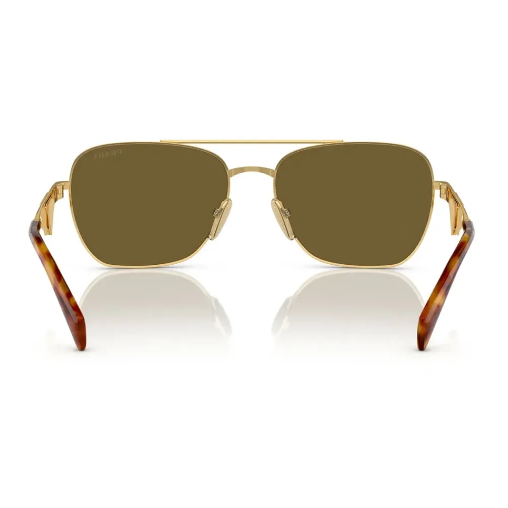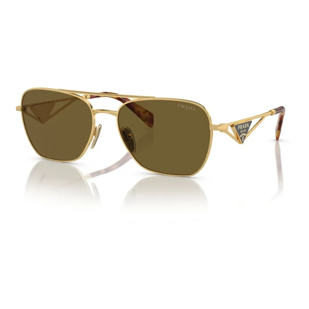 Maak kennis met de Prada Dames Zonnebril PRA50S 5AK01T. Met een spel van lijnen combineert dit Prada-model een onregelmatige voorkant met een geometrisch ontwerp op de pootjes met een driehoekige plaat waarop het iconische Prada-logo prijkt, geïnspireerd op de tassen van het merk en direct herkenbaar. Gouden montuur, dubbele brug en donkerbruine glazen maken dit model perfect voor elke gelegenheid.