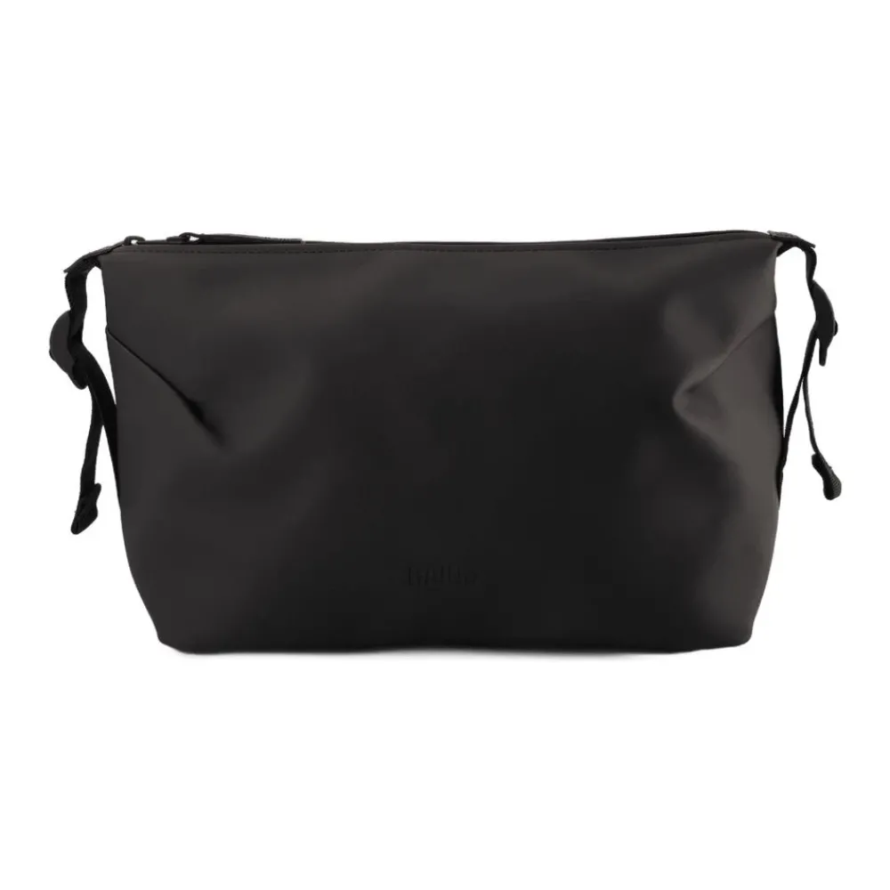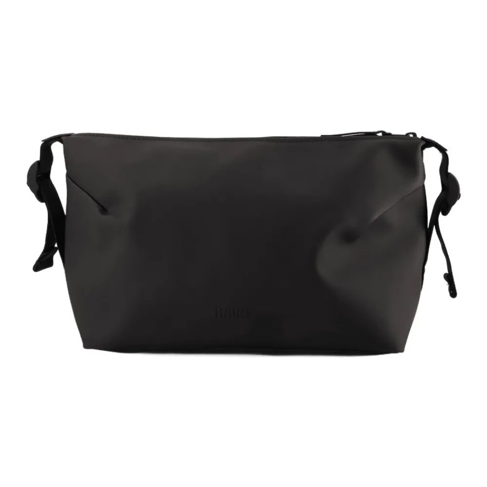 Blijf georganiseerd in stijl met deze handgedragen toilettas van Rains in strak zwart. Gemaakt van polyester met een polyurethaan voering en leren details. Voorzien van een bovenste magnetische sluiting en geen binnenzakken. Afmetingen: 26 cm breedte x 14 cm hoogte x 12 cm lengte.