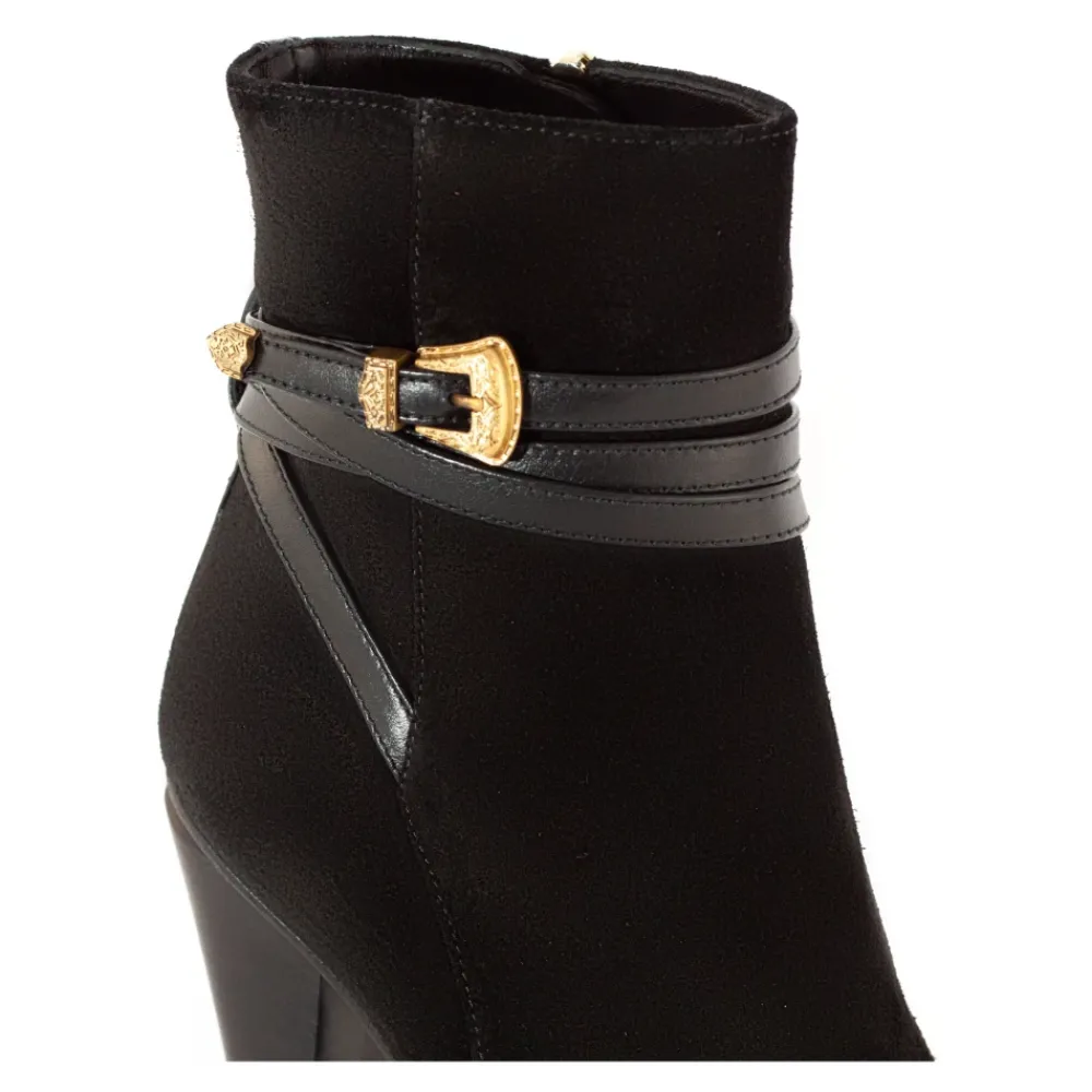 Verrijk je stijl met deze Roberto Festa Dina enkellaarzen in zwart suède leer. Voorzien van een goudkleurige metalen gesp, puntige neus, interne ritssluiting, aantreklus aan de achterkant en een hakhoogte van 9,5 cm. Compleet met een leren zool met logo.