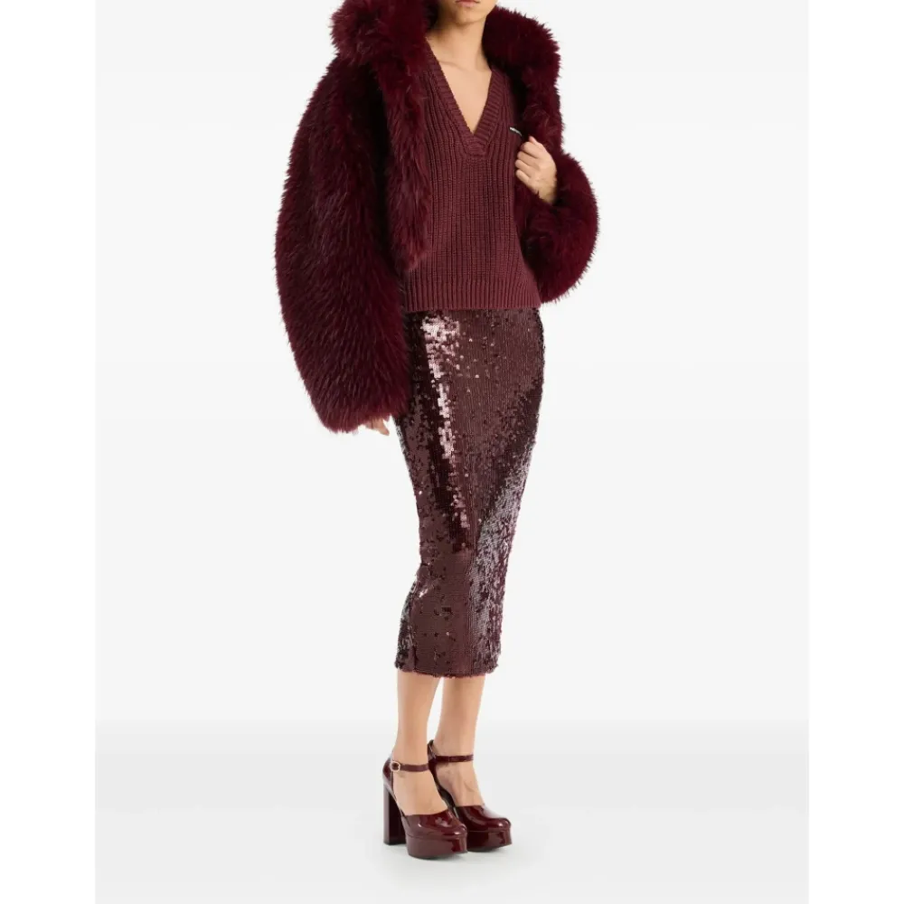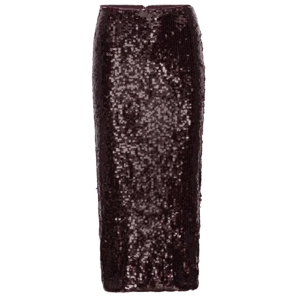 Upgrade je stijl met deze ROTATE Birger Christensen burgundy midi rok met pailletten, potloodvorm en ritssluiting. Gemaakt van 95% polyester en 5% elastaan voor een comfortabele pasvorm.