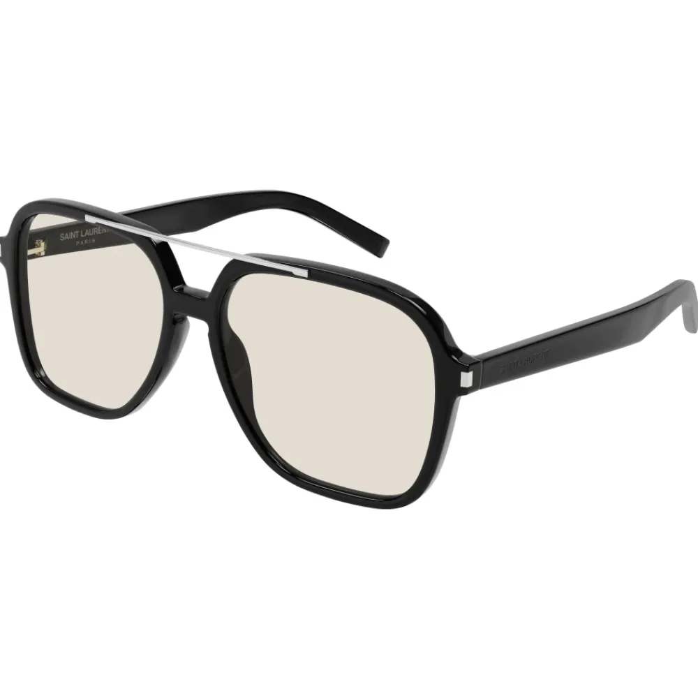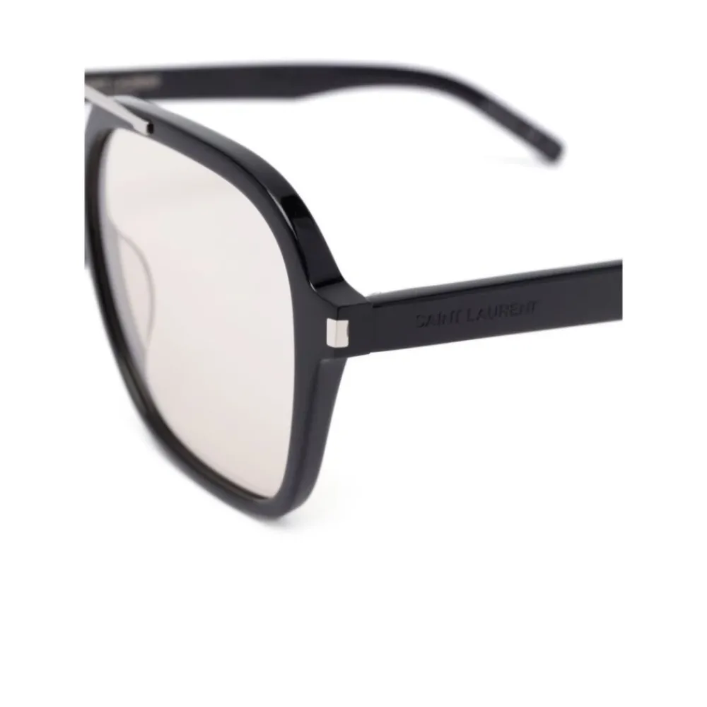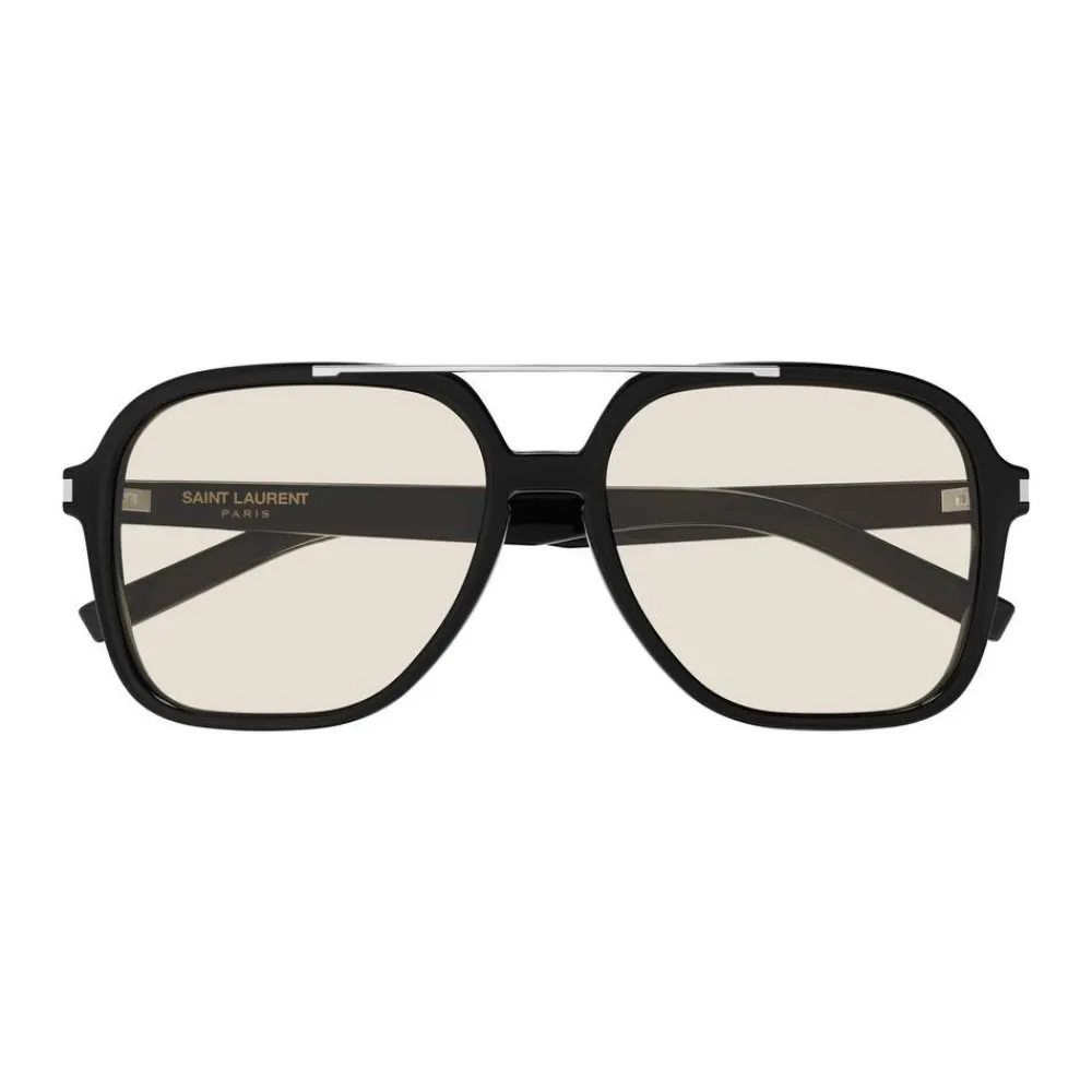 Upgrade je stijl met deze zwarte Saint Laurent zonnebril met geometrische aviator lenzen met een lichtgele tint. De zilverkleurige metalen bovenbalk en acetaat frame voegen een vleugje verfijning toe. Biedt 100% UVA/UVB-bescherming en is compatibel met corrigerende lenzen. Compleet met gegraveerde logo belettering op de pootjes. Lensbreedte: 58 mm; Neusbruglengte: 16 mm; Pootjeslengte: 145 mm.
