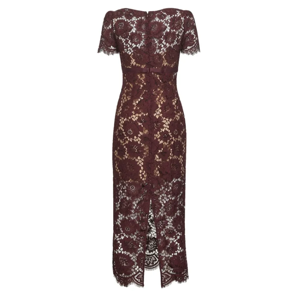 De Self Portrait Bloemenkanten Midi Jurk combineert geschulpte details en een satijnen strik onder de buste voor een verfijnde, gelegenheidsklare look. Belangrijkste kenmerken: Bordeau | Kant | Blinde ritssluiting aan de achterkant | Afneembare, huidkleurige mini cami-voering | V-halslijn met geschulpte rand | Korte mouwen met geschulpte rand | Geschulpte zoom | Satijnen band onder de buste met strikdetail aan de voorkant | Midden split aan de onderkant achterkant | Afmetingen & pasvorm: Aansluitende pasvorm | Samenstelling & verzorging: Kant lijfje: 63% Polyamide, 27% Katoen, 10% Viscose | Kant rok: 48.5% Nylon, 28.2% Katoen, 23.3% Rayon | Voering: 100% Polyester