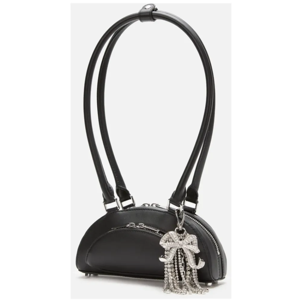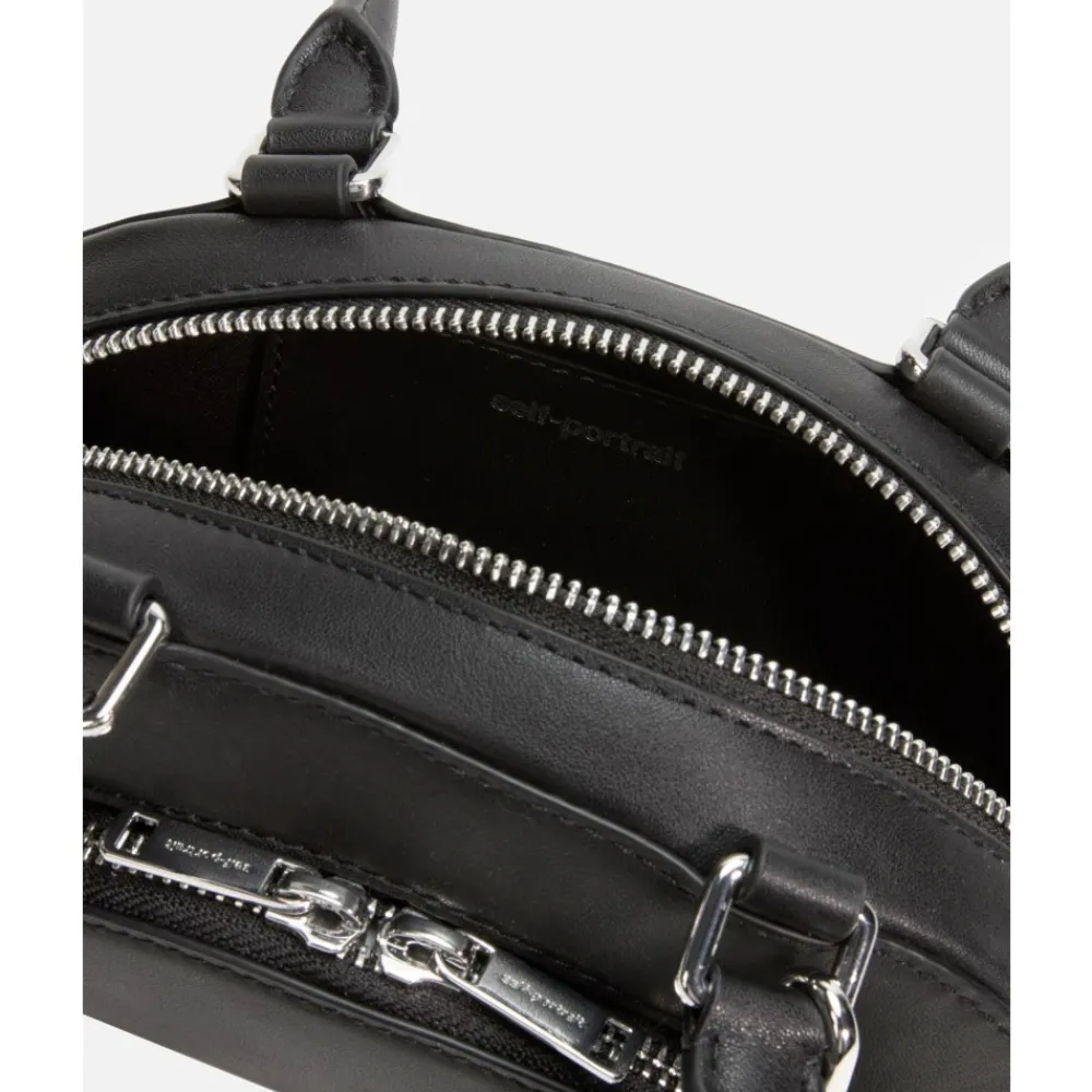 Self-Portrait Mini Schoudertas van leer, met een dubbele ritssluiting en een bedel—compact en elegant voor handsfree gebruik overdag en tijdens avondjes uit. Belangrijkste kenmerken: Zwart | Leer | Dubbele ritssluiting | Externe zak met rits | Intern plat vak | Dubbele handvatten | Metalen voetjes | Bedeldetail | Afgerond silhouet | Compact formaat | Afmetingen & pasvorm: L22cm x H11.5cm x D5cm | Samenstelling & onderhoud: 100% rundleer