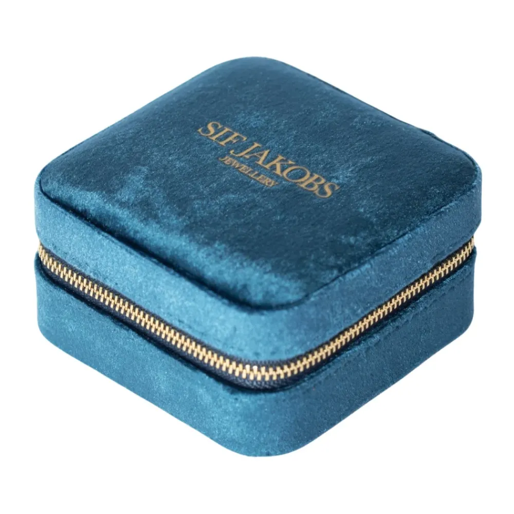 Bewaar je favoriete sieraden veilig en georganiseerd tijdens het reizen of thuis met deze elegante sieradendoos van Sif Jakobs Jewellery. Ontworpen in een lichtgewicht en zacht fluwelen materiaal, is het perfect voor het opbergen van je kostbare accessoires. Afmetingen: 100 x 100 x 50 mm. SKU: SJ-BL-SY10074.