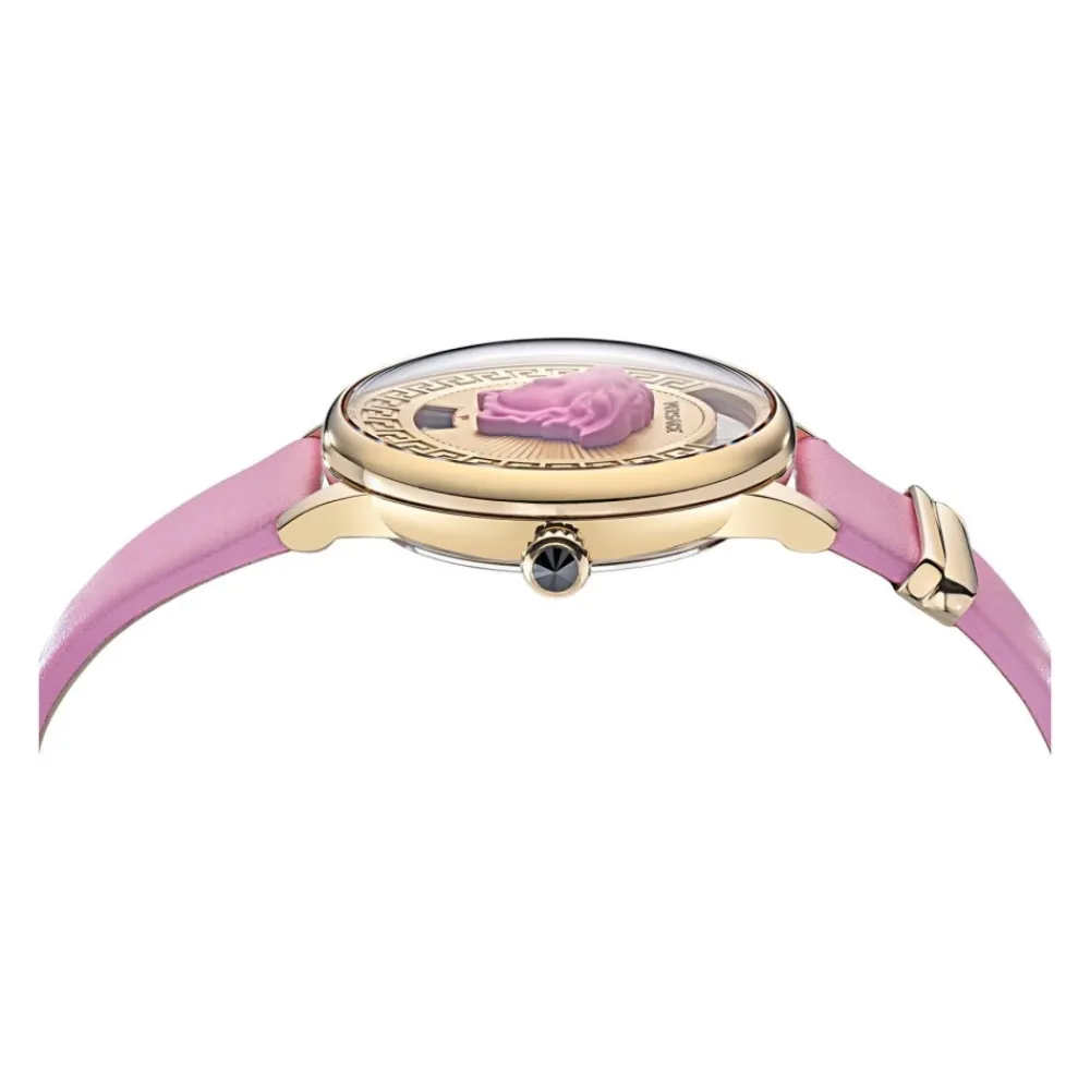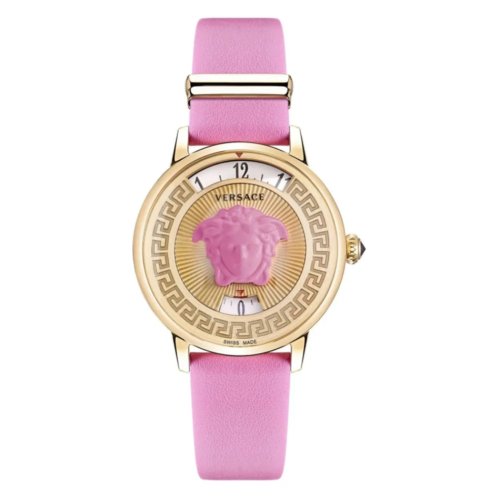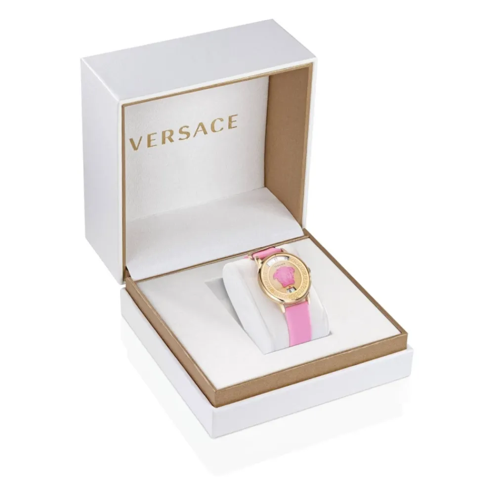 Upgrade je stijl met deze prachtige Versace MEDUSA ICON horloge voor vrouwen. Met een roze leren band, gouden wijzerplaat en roestvrijstalen kast is dit quartz horloge zowel elegant als functioneel. Met een kastgrootte van 38 mm, 5 ATM waterbestendigheid en saffierglas is dit horloge een perfect accessoire voor elke gelegenheid.